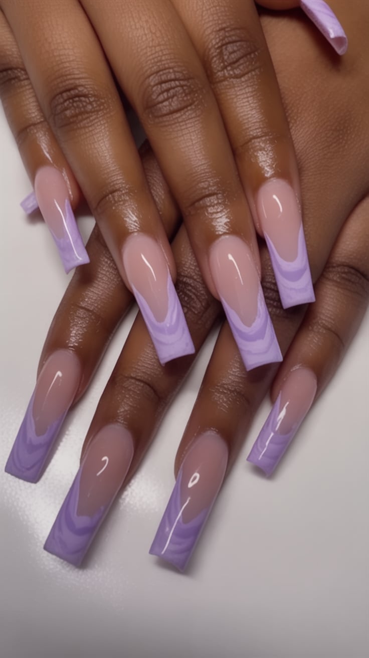 Soft purple swirls drift across a nude base like silk in motion, and the coffin shape adds runway drama without heaviness. Negative space near the cuticle keeps it airy, while the long length makes every gesture feel intentional. It’s dreamy, feminine, and quietly artistic—made for brunches, parties, and that bright summer mood you want to carry into cooler months. Why it works: coffin nails give a slimming effect and suit anyone torn between square and almond. Ask for translucent lilac layers to create depth and keep the pattern concentrated at the tips for balance. Seal with a glassy top so the marbling looks fluid. If you’re hard on your hands, request builder gel for extra structure. This design pairs beautifully with silver jewelry, lavender knits, and dewy makeup.
