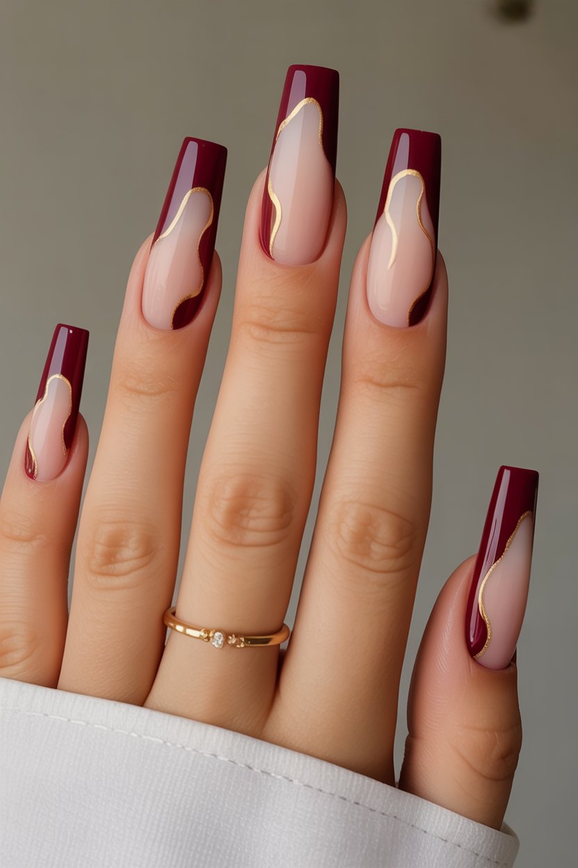 The wine-red frames flow around the negative space, traced with the thinnest lines of gold so the set looks lit from within. On a long square, the curvy borders slim and elongate the nail, giving a dramatic yet wearable couture vibe. It’s evening-ready without the glitter and so flattering with warm skin and gold jewelry. A head-turner that still whispers elegance. Comparison: if a full red feels heavy, this airy design gives the color room to breathe. Versus a classic French tip, the organic waves are more 2026, and instead of the growth feeling harsh, it softens it. Ask for burgundy gel with a fine liner for the gold and seal with a glassy top. Save to your Pinterest designs folder for holiday parties or winter weddings.