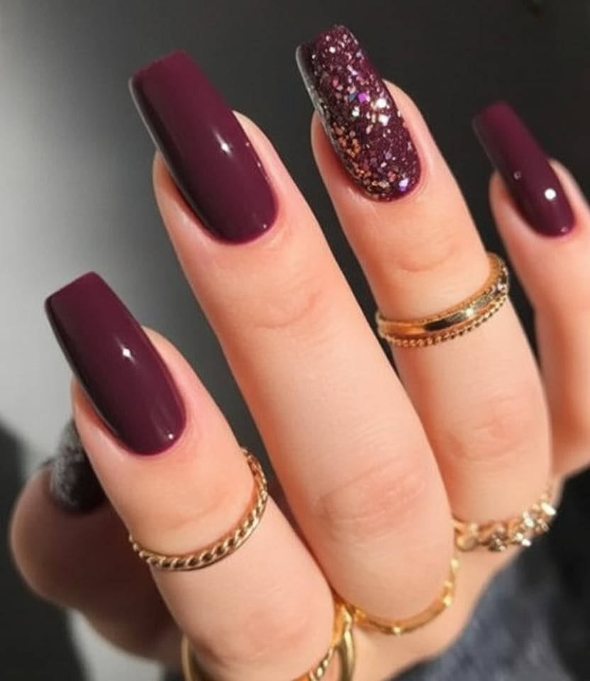 Minimal elegance defines the long square with deep burgundy nails. Most fingers stay creamy and saturated, while one glitter-packed accent delivers a hit of sparkle that feels grown-up rather than party-only. This set matches with any evening glam and works with most modern cuts. The deep burgundy nails also boost colors and add modern class to the clothing. For the chillier seasons, the look works with candlelit dinners. The square edges also give that polished finish, and the single glittering adds to the elegance by keeping the design simple. It works like alternative holiday glam. It is also an easy pick for holiday gatherings without going full red.