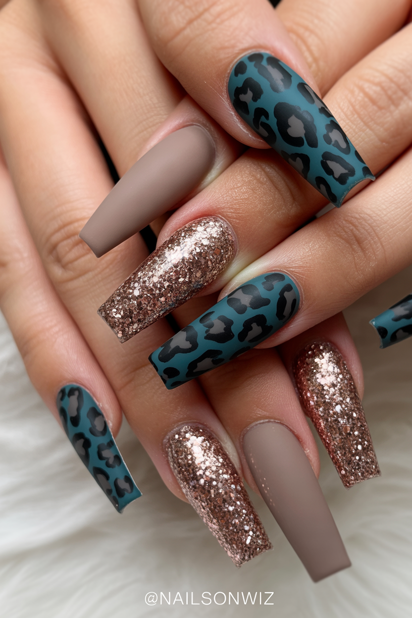 Moody teal leopard meets warm taupe matte, then collides with molten rose-gold glitter—three finishes that play like a capsule wardrobe. The coffin shape gives each finger a tailored, runway line, while the soft neutral nails keep the pattern wearable. It’s sophisticated, a little wild, and perfect for nights when you want sparkle without surrendering to full glam. A true statement for women who love strong lines and rich color. Styling tips or care: keep leopard crisp by using a thin detail brush and layering black spots over a misty teal base. Seal matte nails separately before top coating the glitter to preserve textures. For longevity, cap the free edge on the glitter fingers and request builder gel under the coffin for structure. Pair with brown leather, gold hoops, and a smokey eye; this design transitions from office to dinner seamlessly.