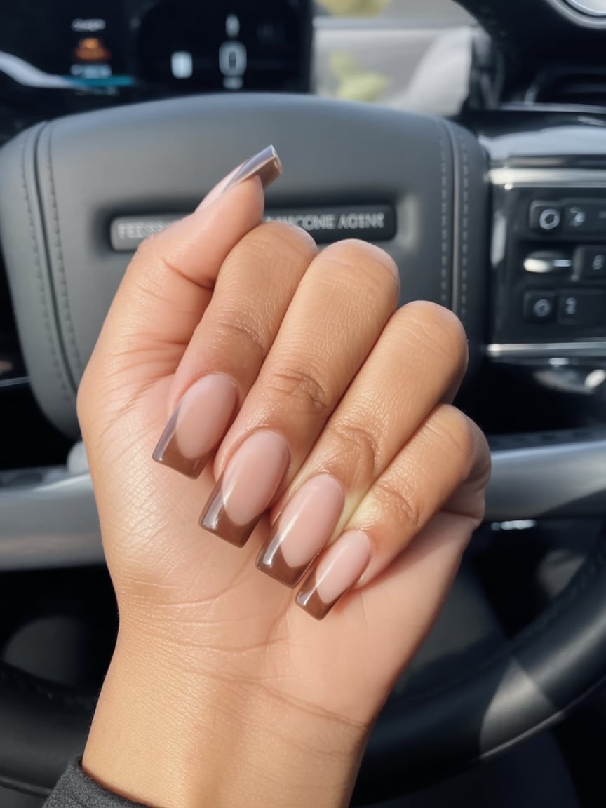 A creamy nude base edged with cocoa brown turns the classic French tip cozy. On a medium square, the line looks crisp and modern, while the warm brown reads quietly luxe—like a latte in manicure form. It’s subtle enough for the office and chic for dinner, the kind of polish that lets your jewelry shine. Proof that simple can still feel rich. Low-maintenance angle: neutral tips disguise growth beautifully, so you’ll get extra wear. Ask for a rubber base for flexibility and a high-gloss top so the brown stays glossy. Keep lengths even and squared for that tailored edge; this shape resists snags and is easy to file at home. Pair with camel coats, gold rings, and natural makeup for a soft finish.