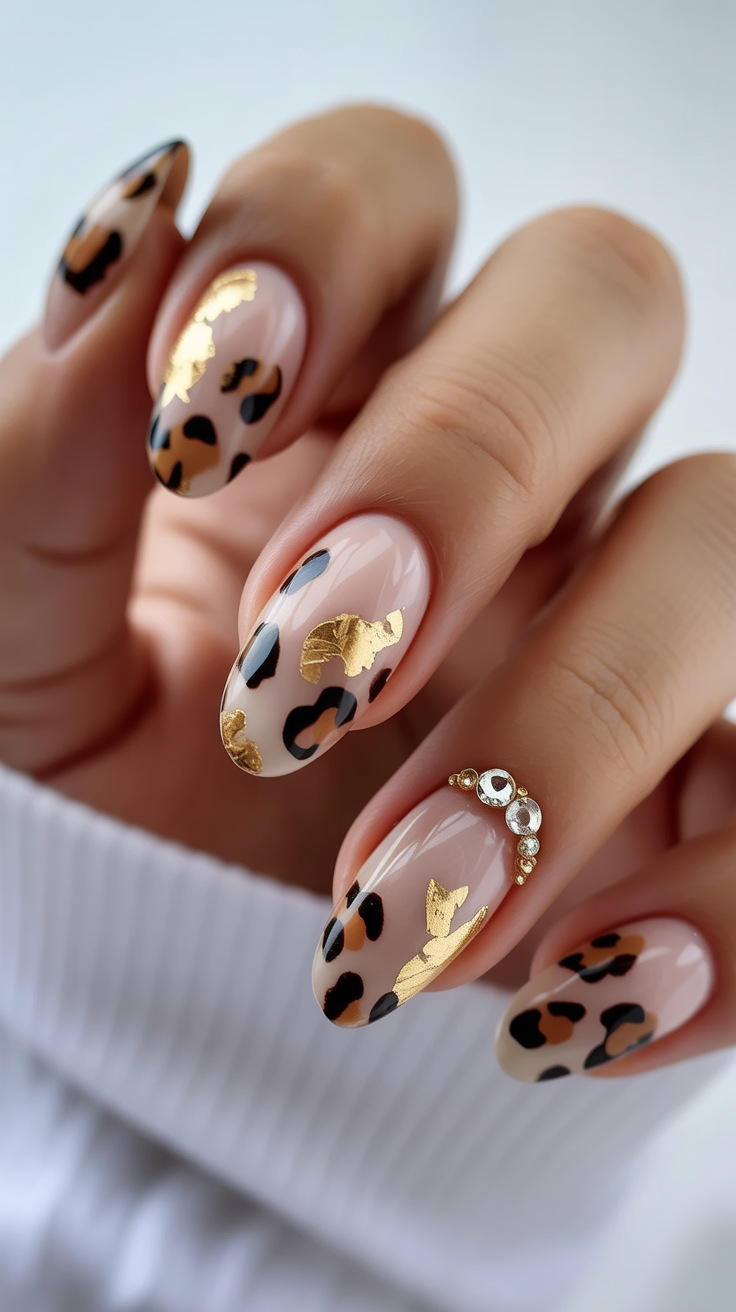 This almond design treats animal print like jewelry: soft leopard spots in brown and black, kissed with hand-torn gold foil, then finished with a delicate crystal arc at the cuticle. The result shimmers without shouting, catching light as you gesture and making even a sweater feel dressed up. It’s luxe but approachable—the kind of manicure that looks intentional with both denim and a slip dress and lands firmly in the ideas folder for unique designs. Trend note: animal prints are back as “neutrals” for 2026. Keeping the palette natural and spacing the foil creates dimension without bulk. Ask your tech to cap the free edge with clear gel so foil stays smooth, and choose medium almond for strength with elegance. Pair with camel, chocolate, or black accessories; add a warm brown lipstick to echo the spots. Low-effort, high-impact, and perfect for busy weeks.