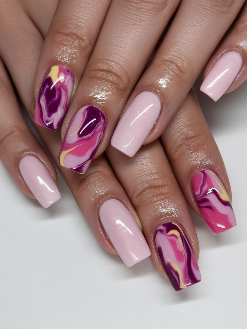 Creamy pink squares get a marbled makeover with ribbons of fuchsia and a whisper of yellow swirling through select nails. The finish is glossy and smooth, like polished stone, and the palette feels cheerful rather than sugary. It’s artsy without being loud, perfect for brunches, showers, or just brightening a Tuesday. A joyful take on pink that still reads chic. The vibe or attitude: upbeat, optimistic, and a touch retro—like a silk scarf tied on your wrist. The square shape keeps it modern and practical, and the mix of solid and marbled nails balances drama with ease. Ask for translucent layers to create depth and cap the free edge for durability. Wear with denim, white shirts, and rosy lips for a fresh, summer-leaning mood.