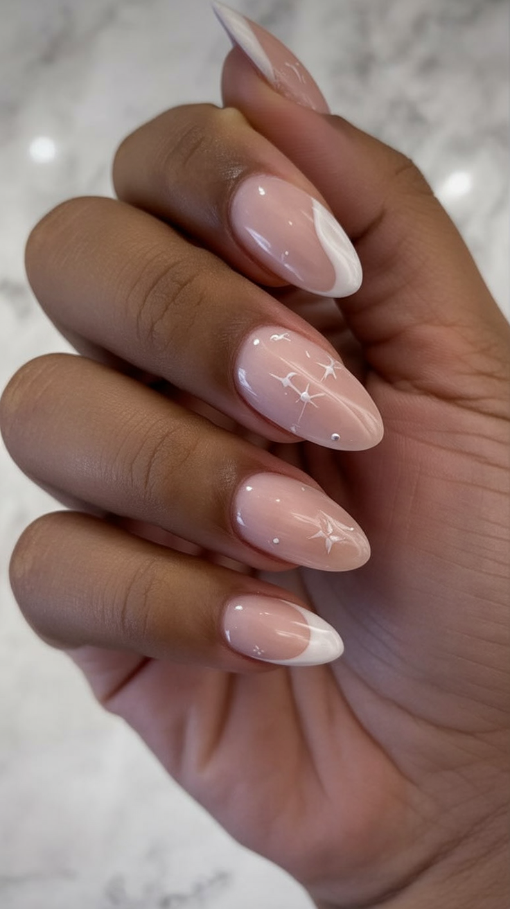 Sometimes the freshest choice is whisper-soft. A sheer pink base with delicate white French tips feels clean and polished, while tiny stars add a subtle sparkle that catches light without glitter. On a short almond, the look is graceful and practical—perfect if you love timeless designs with a little romance. It’s office-friendly, wedding-friendly, and beautiful for every day. Care instructions: short lengths are great for active hands and fine hair tangle-free moments. Ask for a thin, tapered French tip to keep things modern, and consider a milky base to blur any imperfections. A weekly topcoat refresh extends wear; cuticle oil maintains that glow. Pair with soft neutrals, pearls, or a barely-there highlight for a polished, natural finish.