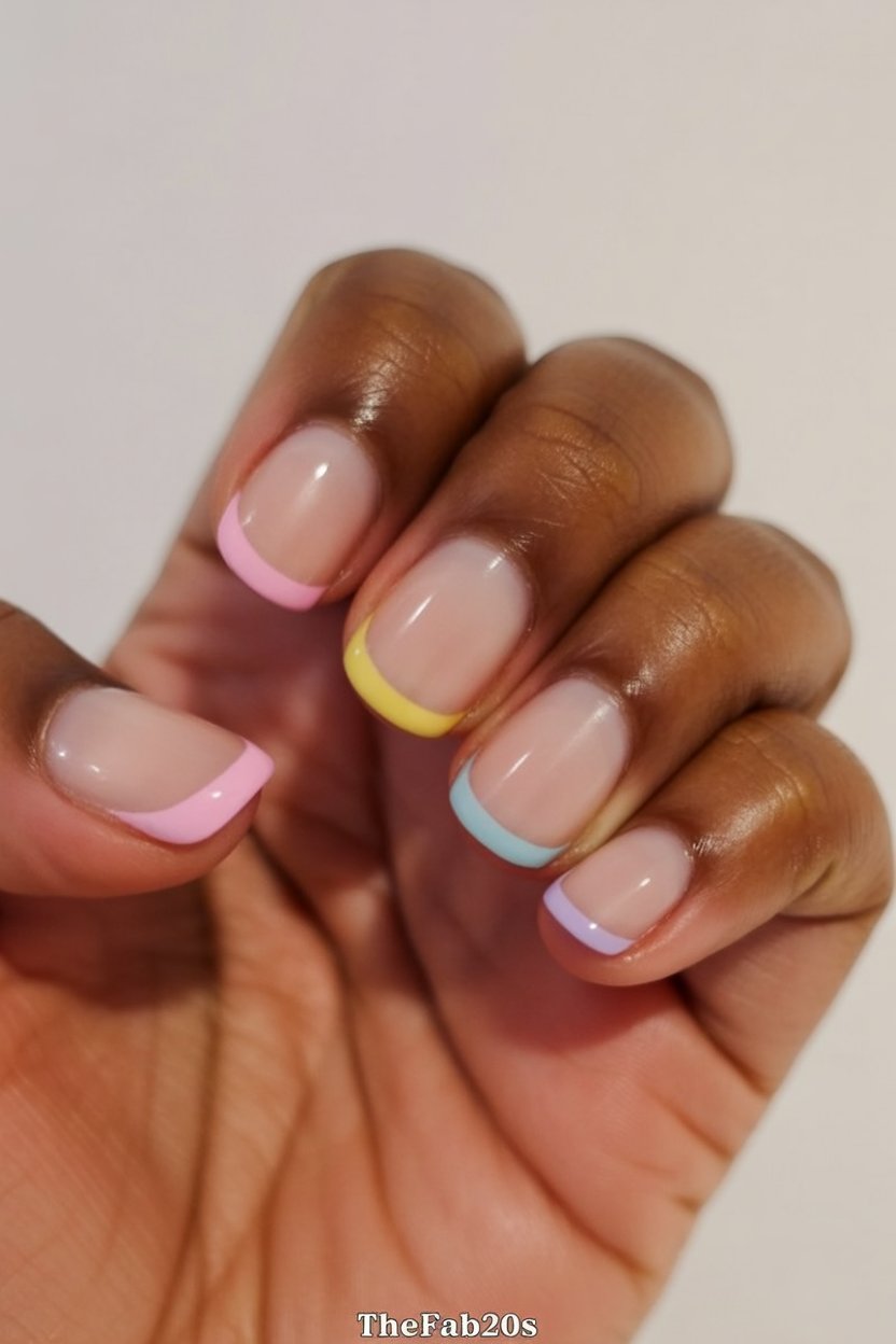 Soft pink, lemon, sky blue, and lilac skim along the edges of short nails like confetti—light, bright, and cheerful. The sheer base keeps everything clean and natural, so the color feels whisper-soft instead of sugary. It’s the sweetest nod to summer and vacations, and it makes everyday rings look instantly more playful. If your style leans minimalist but you love color, this is the perfect middle ground. Emotional payoff: every glance at these tiny rainbow tips is a mood lift. Short lengths mean zero fuss with zippers, keyboards, or hair, and the multicolor French tip satisfies your craving for designs without committing to nail art. Ask for ultra-thin lines to keep it grown-up. It’s cute, polished, and incredibly wearable from Monday through brunch.