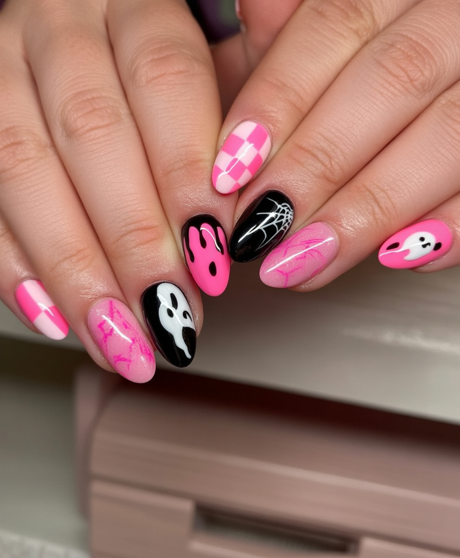 Who says spooky can’t be cute? A vivid pink palette collides with playful ghosts, webs, and drips, and the result is cheeky rather than scary. Alternating art across the set keeps the eye moving, while the glossy finish adds a candy-coat shine. It’s the manicure that makes October feel like a party and still works for fun weekends the rest of the year—think Barbie meets Halloween with a wink. Low-maintenance angle: keep the art at medium lengths so everyday tasks stay easy. Ask your tech to anchor detailed lines on the ring and middle fingers and keep the others Simple for balance. A rubber base protects the nail, and a hard gel top preserves the tiny details. Wear with a denim jacket, a soft sweater, or a black tee; the contrast makes the pink pop and photographs beautifully for Pinterest.