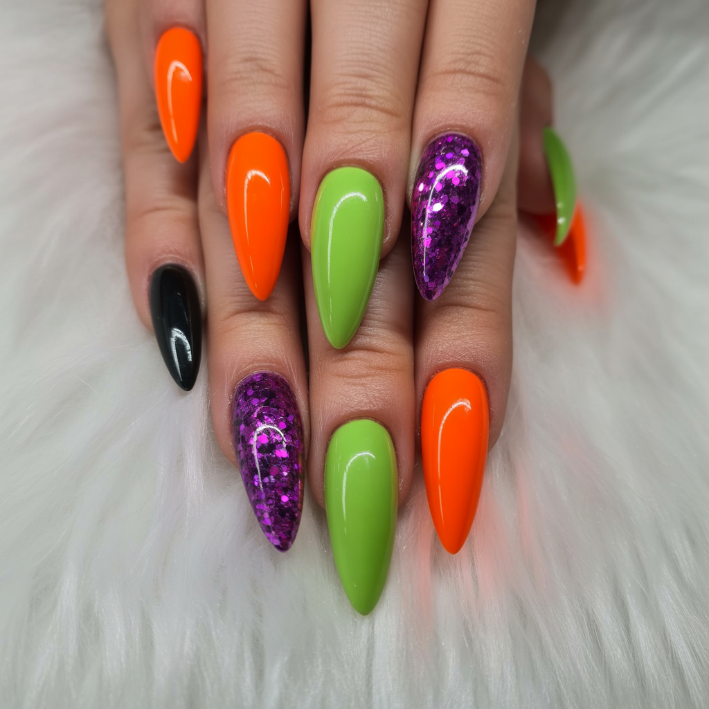 Picture a party you can wear: a manicure of zesty green, blazing orange, and amethyst sprinkled shimmer racing across the tips. The high-gloss finish on every almond shape makes each color look crunchy. The single black nail added a cool pause, so the brights feel intentional, not garish. It’s the errands-complementing manicure, the one you screenshot to Pinterest because the blend of textures and shades feels so unique. Think summer festival with bold and bright colors, then cooler months without losing the fun. Who’s it for: Choose this if you love almonds for their elongating effect and want ideas that read bold but are still polished. The color blocking flatters every skin tone, and the glitter accent keeps the design lively without needing the nail art. Rubber bases serve the extra strength and pair the set with white tees, denim, and lipstick that leans coral or pink.