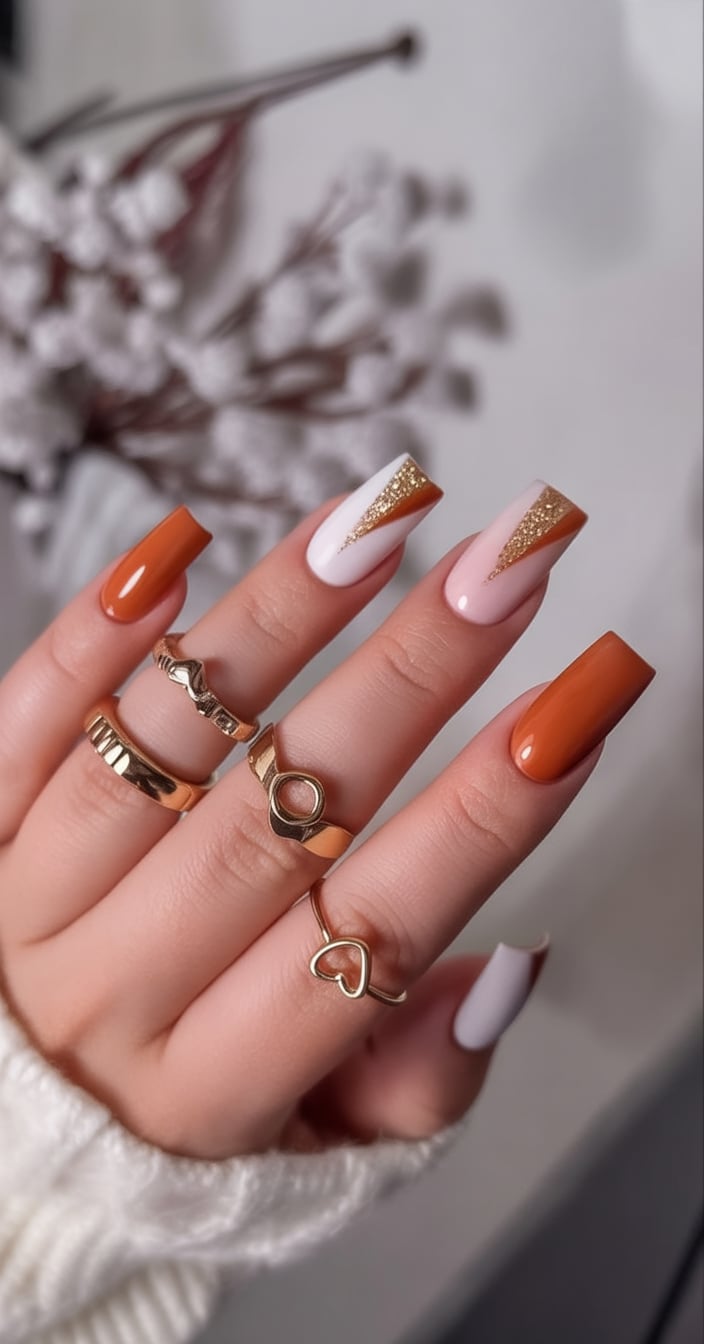 This geometric French features warm pumpkin, blush, and crisp white, while slim gold triangles add just enough sparkle for a party-ready look. On a medium coffin or short square, the colors read cozy-chic, like your favorite knit and latte, but make it a manicure. It’s cheerful for fall, flattering on every hand, and surprisingly versatile with denim, camel, and black. The motivation to try it now: seasonal color keeps your look current without the feeling of a costume. Ask your tech to angle the French line upward to elongate the nail and place the glitter triangles near the tip for a more forgiving look during growth. The warm tones look richest against healthy skin, so finish with a high-gloss top coat and commit to cuticle oil. Consider swapping pumpkin for green or brown later for a quick refresh.
