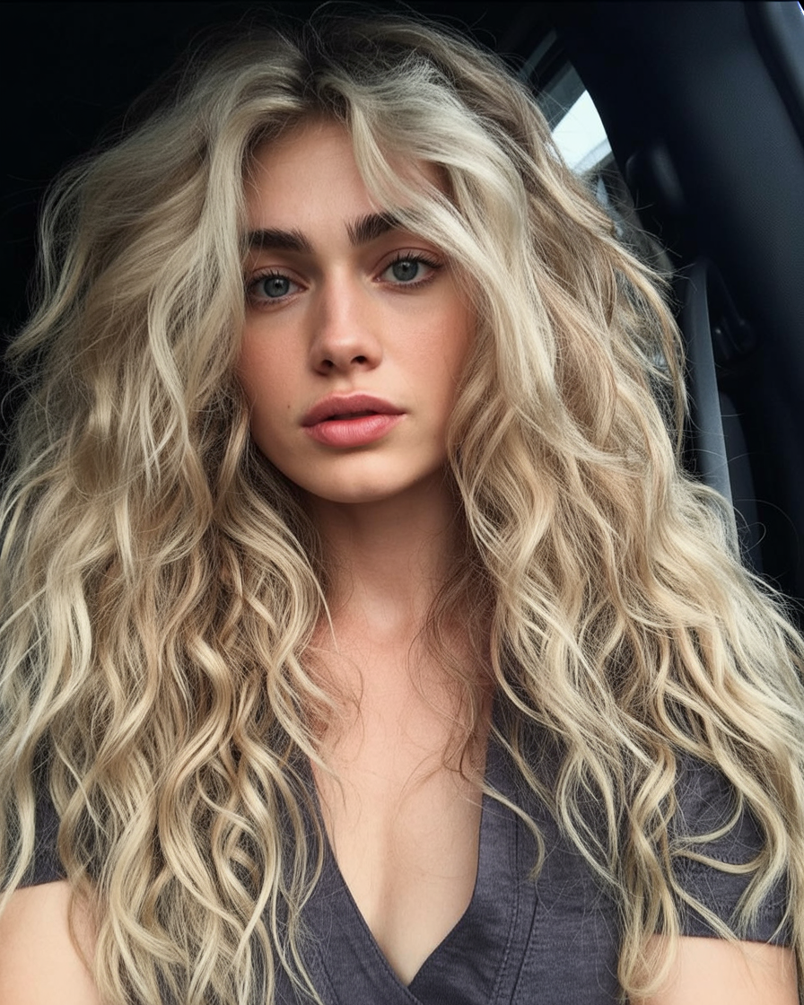 There’s something wonderfully free about this cloud of curls and waves framing the face. The beach blonde color is softly blended with sandy lowlights, so it never looks flat, even when the hair is huge and full of personality. Loose, airy texture gives it that just-stepped-out-of-the-convertible feeling, while the longer fringe pieces skim the brows for a flattering, slightly mysterious vibe. It’s bold but still feminine, the kind of hair that makes a simple tee and jeans look suddenly intentional and styled.