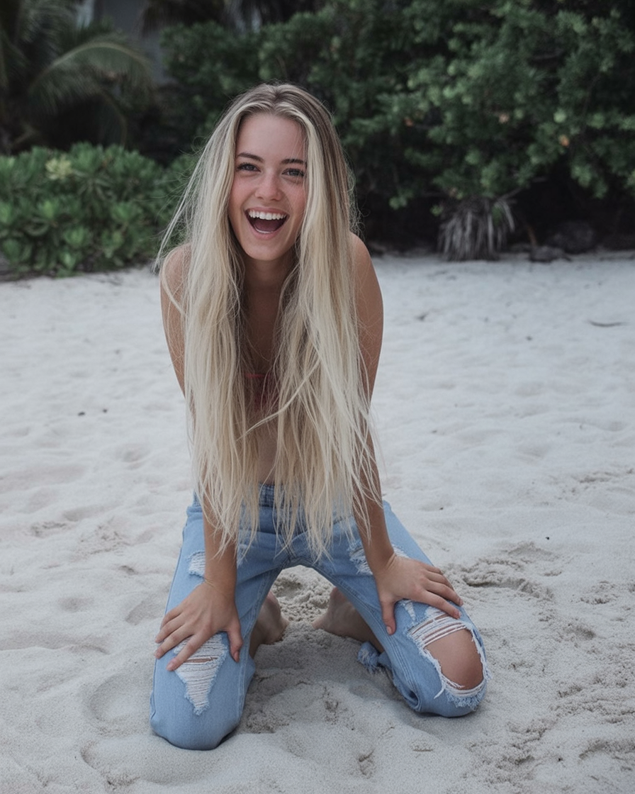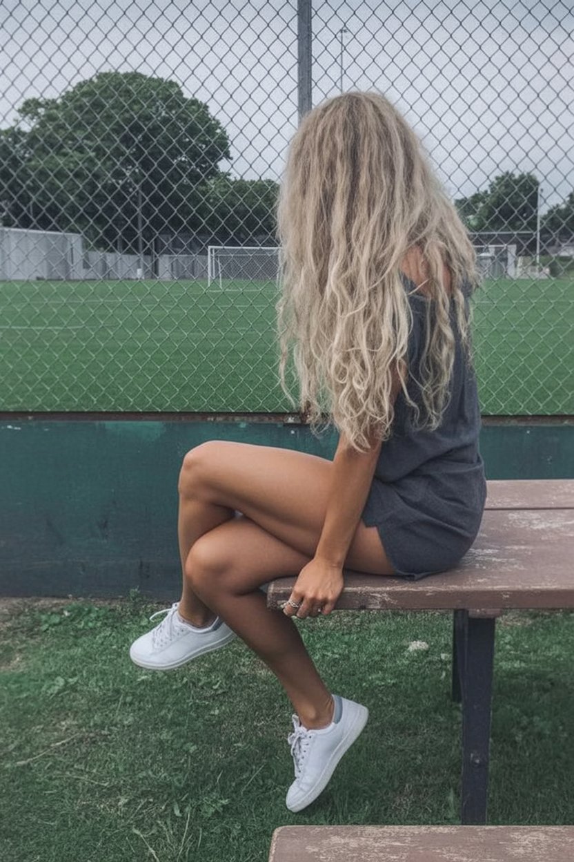 These long, slightly unruly waves have that lived-in, salt-kissed texture that looks like you’ve spent the whole day outdoors. The blonde color is soft and muted, more sandy than icy, which makes it incredibly wearable and flattering against tanned skin. It’s the kind of hair that looks just as good at a casual game or picnic as it does at a late-night hang, with movement that never feels overstyled. There’s a carefree confidence in letting the natural texture have its moment.
