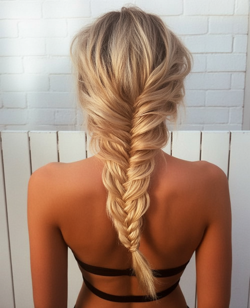 This loose fishtail braid feels like you’ve captured the whole beach in your hair. The golden blonde color glows against sun-kissed skin, and the braid itself is pulled out just enough to look soft and romantic instead of tight or formal. Every twist shows off subtle shifts in tone, from buttery mids to slightly lighter ends, like light reflecting on the water. It’s casual, feminine, and ideal for days when you want your hair out of the way but still pretty.