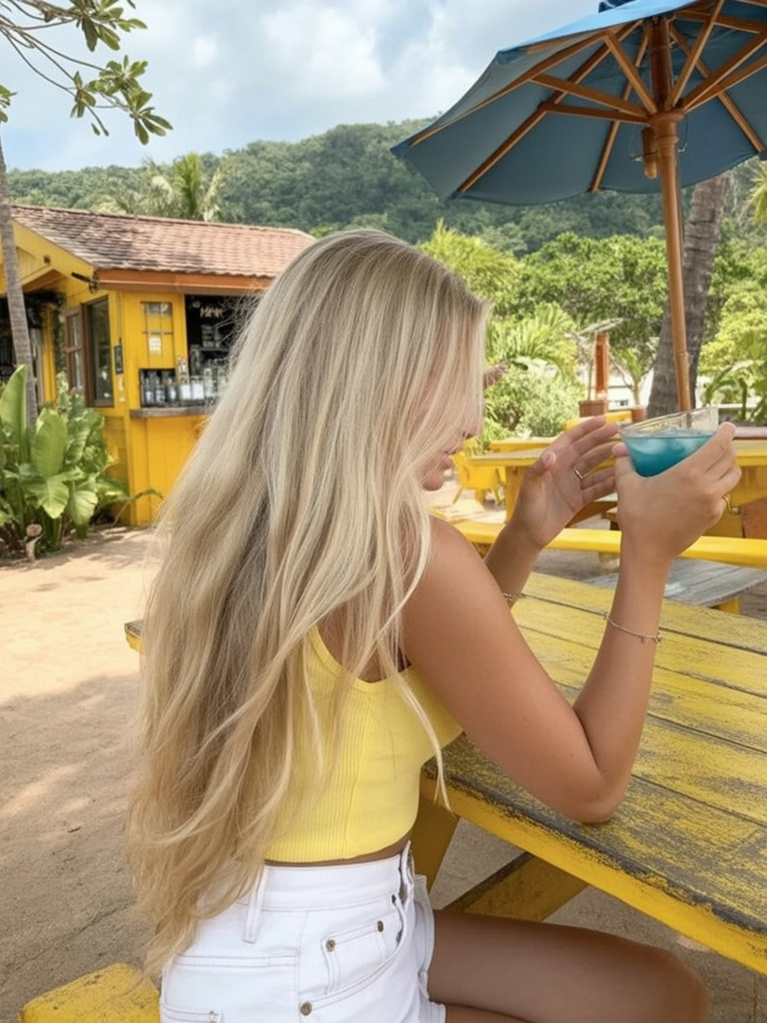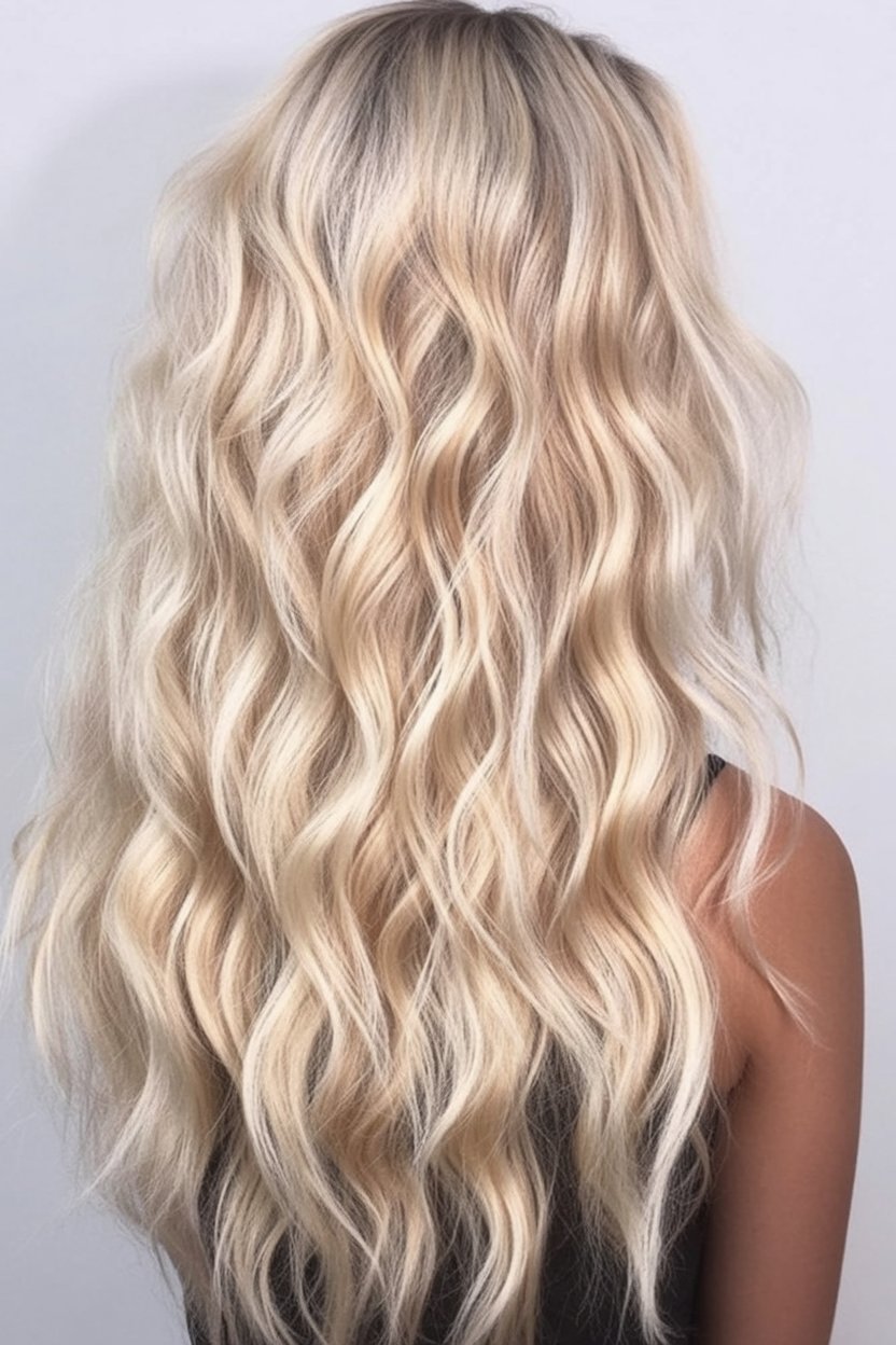 These soft, rippled waves appear as if they were air-dried on some oceanfront balcony side. The blond is a light, vanilla-toned shade that’s bright but not too much of an icy hue; it has enough warmth to be flattering and wearable. Soft bends add movement to hair without looking overly “done,” and the result is light, playful, and quietly polished. It’s the ultimate everyday beach blonde for women that want to feel like their best selves, even on days where they are most casual.