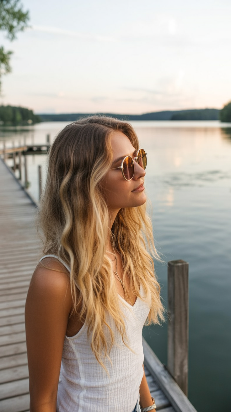 This look is great combined with sunkissed bronzer, light layered necklaces, and effortless summer workwear—you don’t really need much more. Ask your colorist for “ombre-inspired color highlights” that slowly lighten toward the tips, then use a big-barrel iron to create loose bends (not tight curls). Finish with a spritz of salt spray for that pretty, barely-there texture that’ll hold up through dock walks, patio dinners, and all the things.