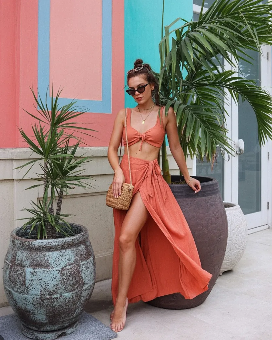 This outfit feels like golden hour bottled into a look—warm, earthy, and effortlessly sensual. The terracotta tone flatters sun-kissed skin beautifully, while the wrap detail adds movement and a hint of drama without going over the top. It’s relaxed but still undeniably Hot.