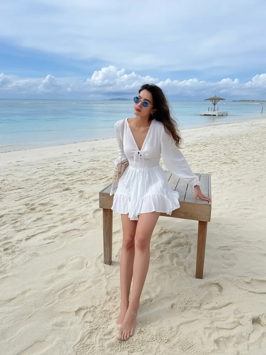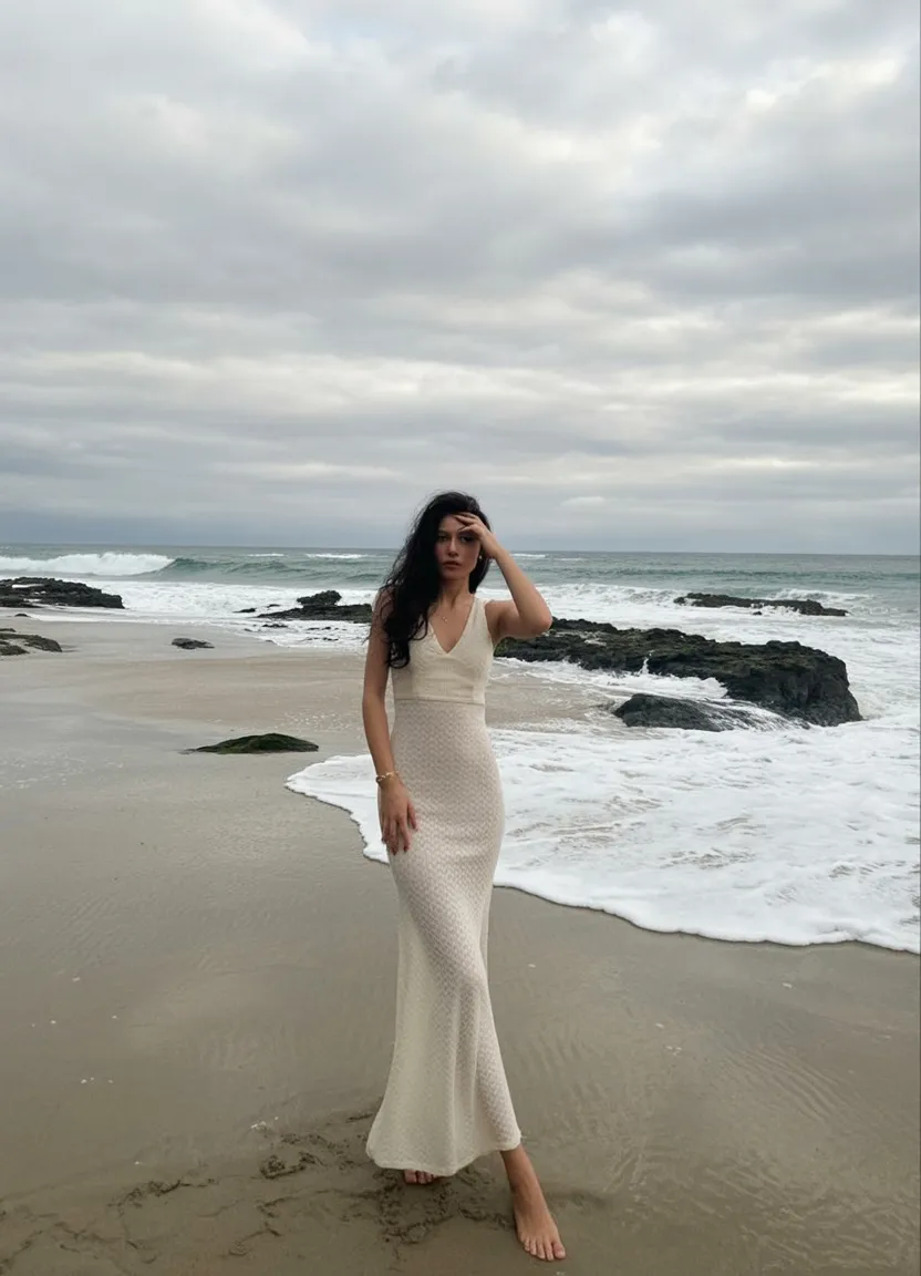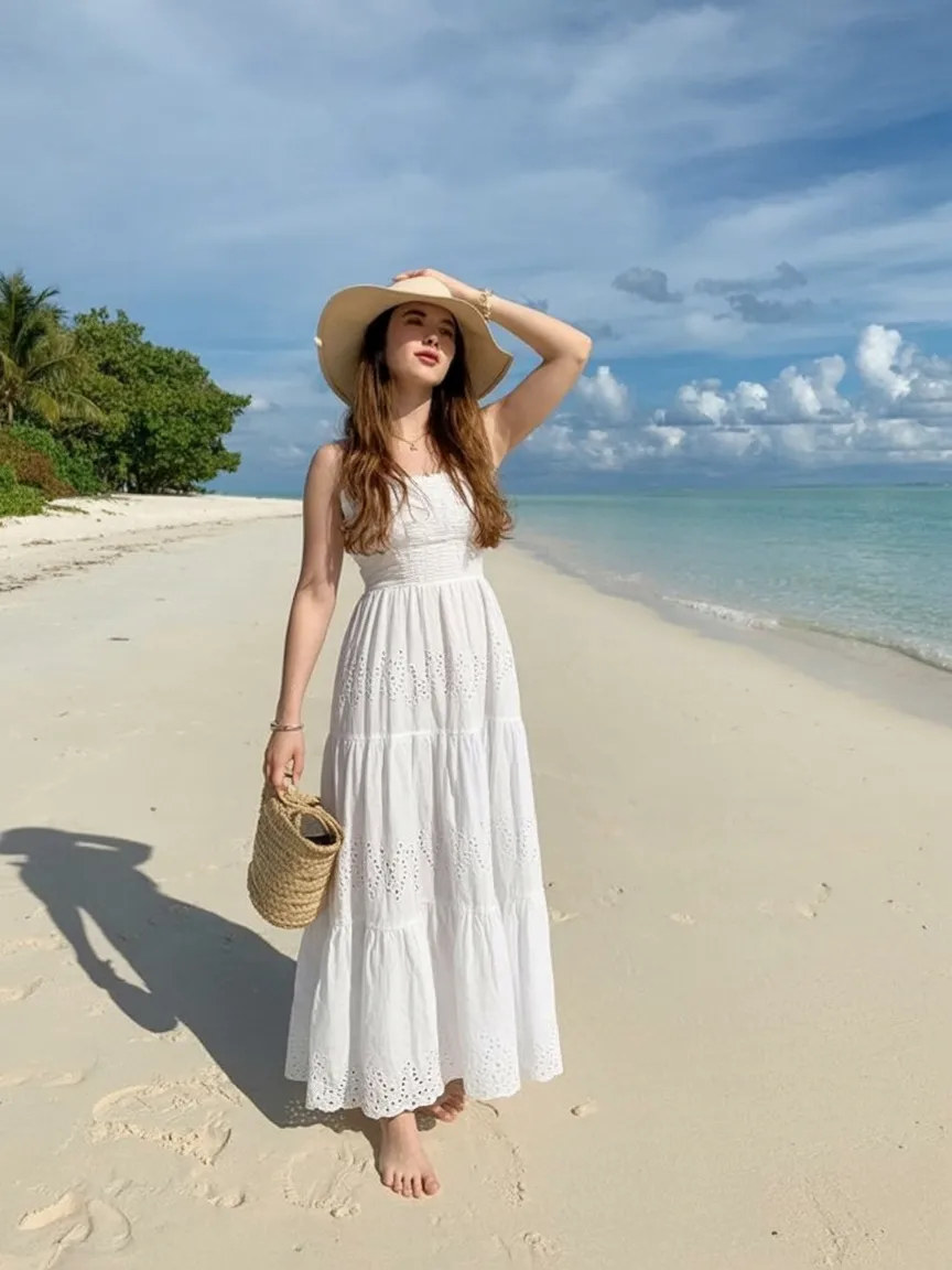 This look feels like the definition of a slow, beautiful morning by the sea—soft light, bare feet in warm sand, and a dress that moves as gently as the breeze. The long white silhouette creates that dreamy, almost timeless mood, while the straw hat adds a quiet sense of intention. It’s calm, feminine, and effortlessly Aesthetic in the most natural way.