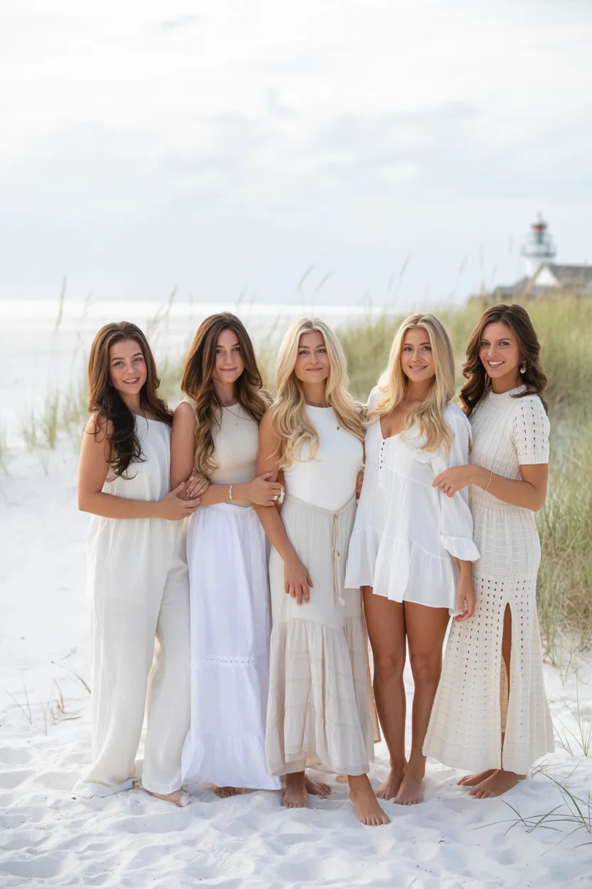 There’s something so satisfying about a group of outfits that just flow together—soft neutrals, light fabrics, and a shared sense of ease. It feels like a curated moment, but still natural and unforced. Each look complements the other, creating a cohesive, effortlessly Stylish beach aesthetic.