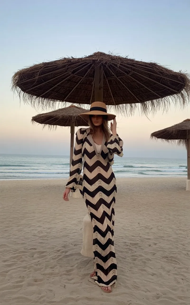 There’s a quiet elegance to this look that feels almost cinematic—like a slow walk along the shore at sunset. The chevron pattern adds visual interest without overwhelming, and the long silhouette creates a sense of calm, grounded beauty. It leans into that understated Aesthetic that never goes out of style.