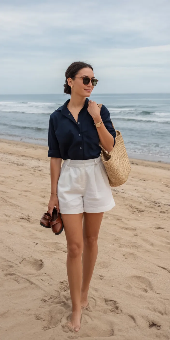 This outfit has that polished, effortless energy that makes you look instantly put together. The crisp shirt paired with tailored shorts creates a balance between relaxed and refined — perfect for those moments when you want to feel comfortable but still a little elevated. It’s a fresh take on Business casual by the beach.