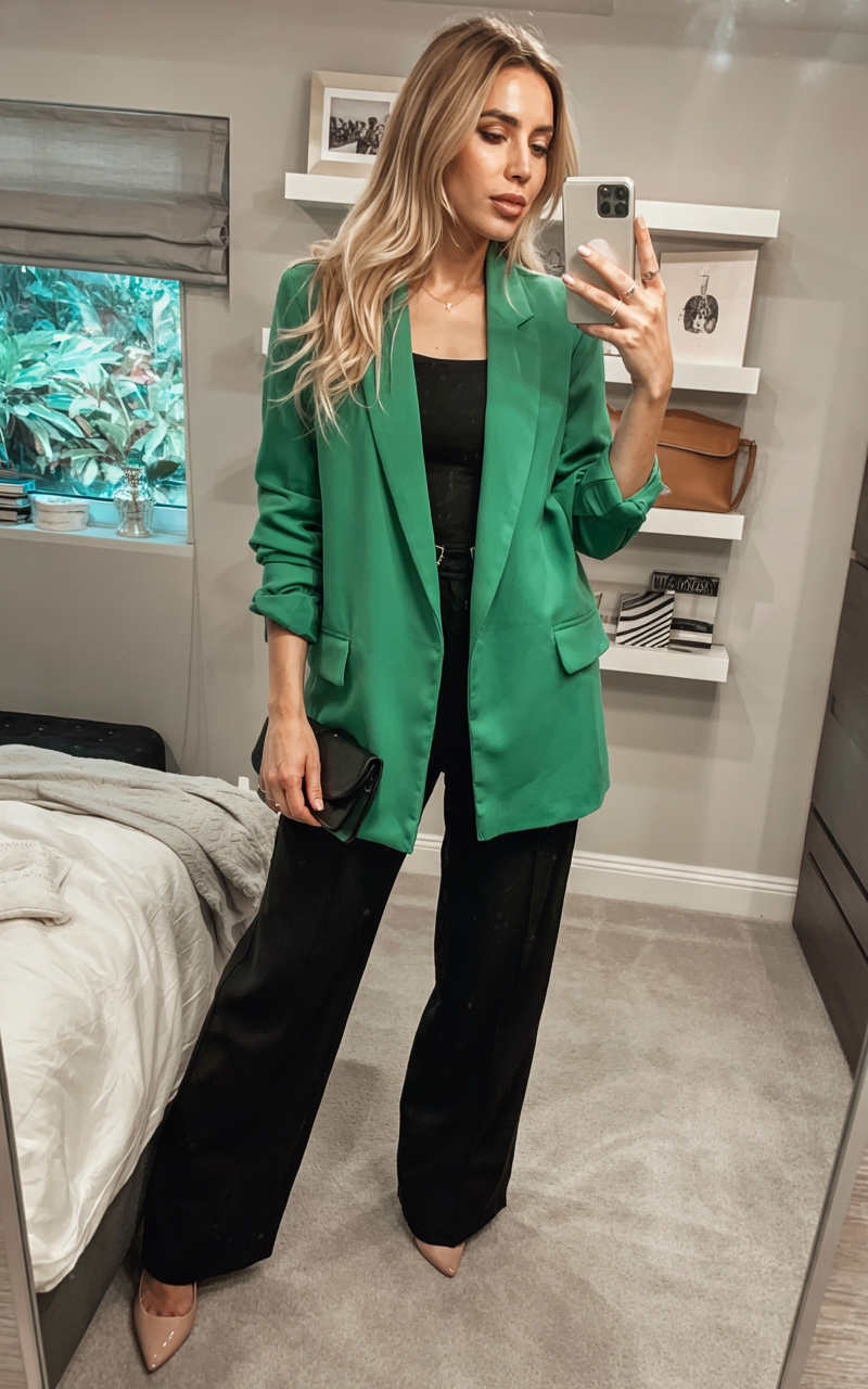 This look is such a chic reminder that you don’t have to live in Black to feel sophisticated. The rich green blazer instantly brightens the whole outfit, yet it still feels grown-up and elegant, not loud. Paired with wide trousers and nude heels, it’s one of those blazer outfits 2026 is all about: confident, streamlined, and secretly very comfortable. You could walk into a dinner, a meeting, or a date in this and feel completely in control.