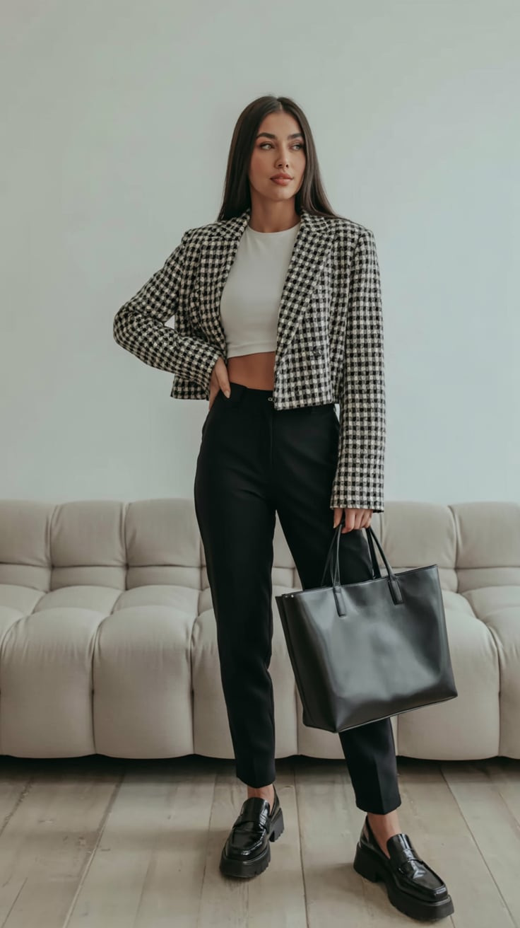 If you’ve been curious about cropped looks but don’t want your stomach fully on display, this is a great middle ground. The blazer’s strong shoulders and shorter length keep the proportions balanced, especially if you’re on the petite side or want to visually lengthen your legs. Lean into neutral tones—black, white, and grey—so the pattern does the talking, and let the accessories stay sleek and minimal for classy, everyday wear for women.