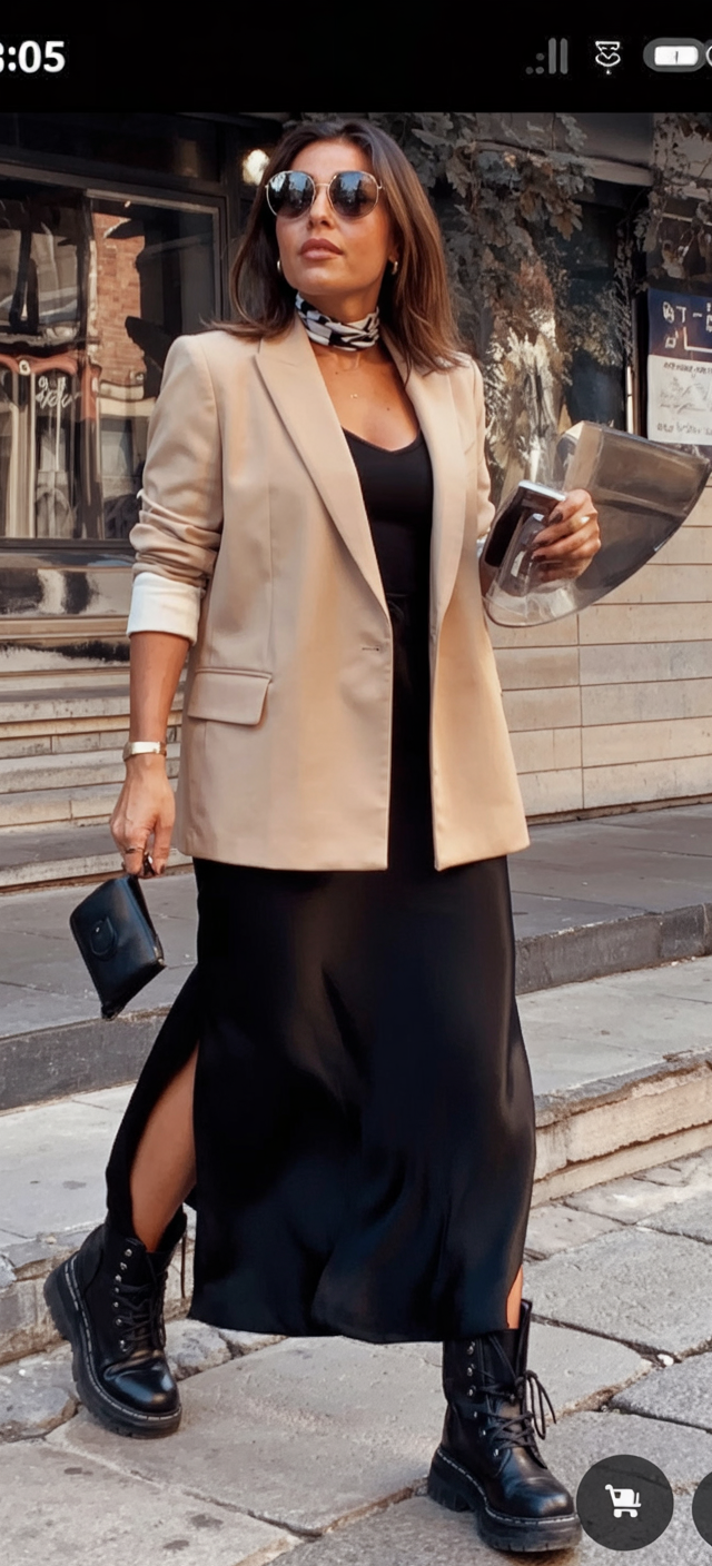 There’s such a cool tension in this outfit: the sleek satin skirt and fitted tank feel dressy, while the beige blazer and chunky boots pull everything back into everyday territory. Add a scarf at the neck and bold sunglasses, and suddenly it looks like you’ve just stepped out of a European city break. It’s polished without feeling stuffy, and the mix of textures keeps it visually interesting from every angle.