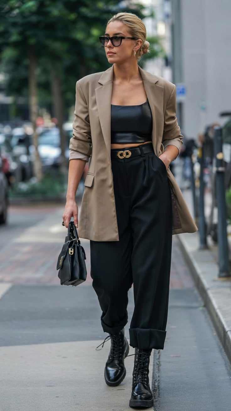When you want to channel your inner city girl, this is the look. The long taupe blazer in The long taupe blazer in a soft neutral tone frames the sleek black crop top and tailored trousers, while lace-up boots ground everything with a bit of edge. It’s powerful without being stiff and modern without trying too hard. The small flash of skin keeps it playful, but the overall effect is still very polished and grown-up.