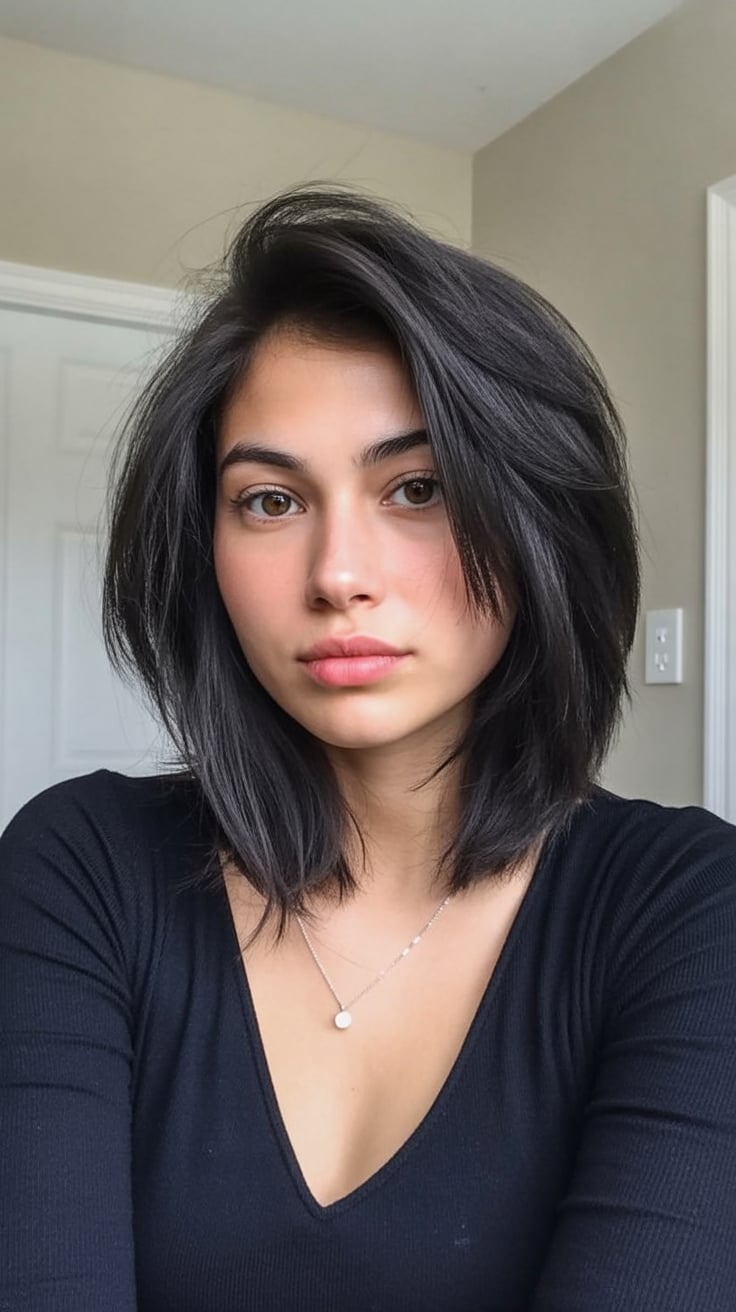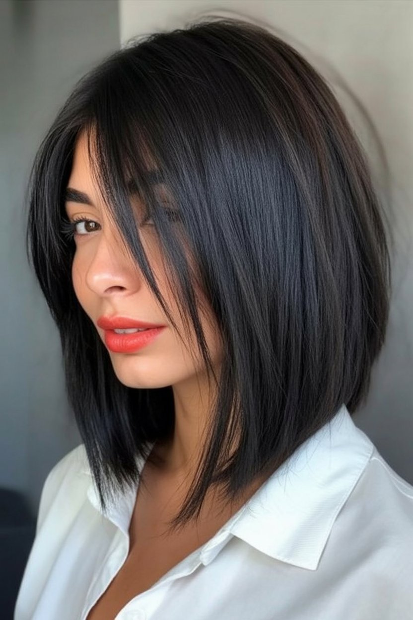 This angled bob is effortlessly chic. The back is a tad shorter and raises up to the nape, while the front pieces go below the chin for that quintessential 2026 bob haircut shape. The soft layers around the face prevent all that dark hair from falling too heavily, and the side-swept front section delivers a touch of drama without fully committing to bangs.