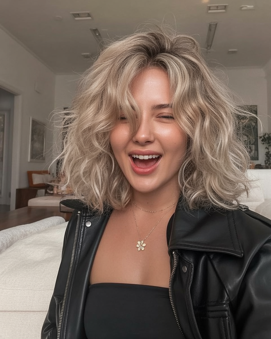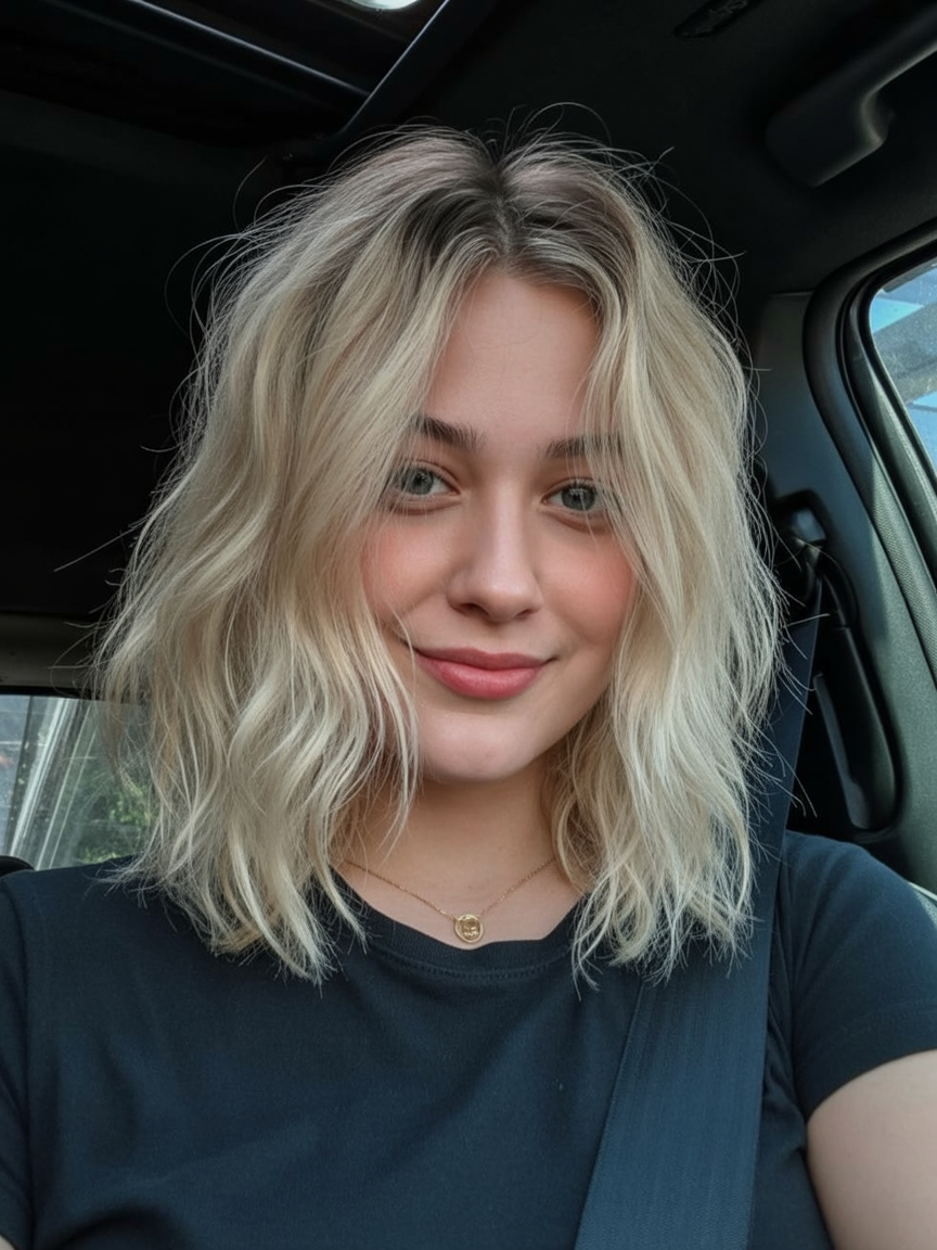 This soft, textured blonde bob has that easy, off-duty band-girl energy that just seems right for 2026. The middle-forward length is a little above the shoulder with some loose waves that seem as if they were achieved by salt air and good music, rather than a curling iron. A loose middle part keeps the face from feeling too severe, and the shade of light blonde is warm and sun-kissed, simultaneously brightening up a complexion but also making the look feel youthful, current (pun intended), and mildly rebellious.
