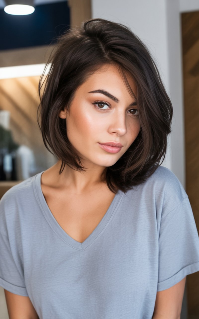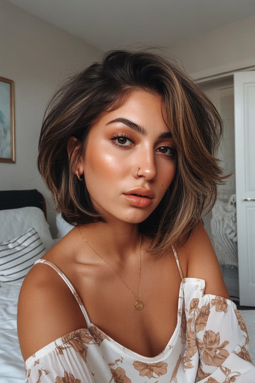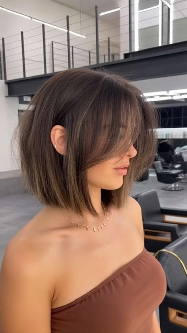 This bob looks like it literally stepped out of a sunny piazza—full, bouncy, and oh-so sexy. The volume is bumped up and over to one side, with wavy pieces that hit the jaw and collarbone in the most own-it sort of way. Rich brown hair with subtle face-framing highlights creates the kind of warmth and glow that gives us that Italian movie-star energy without looking like you’re trying too hard.