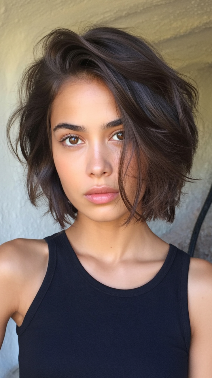 This soft, wavy bob has a romantic and undone feel, with side-swept volume through the ends. The cut falls at the collarbone, so you get that in-between length—still short but with a hint of long lob drama. The rich brown hue means you stay sophisticated, but the big swoosh around the cheeks can add a flattering lift.
