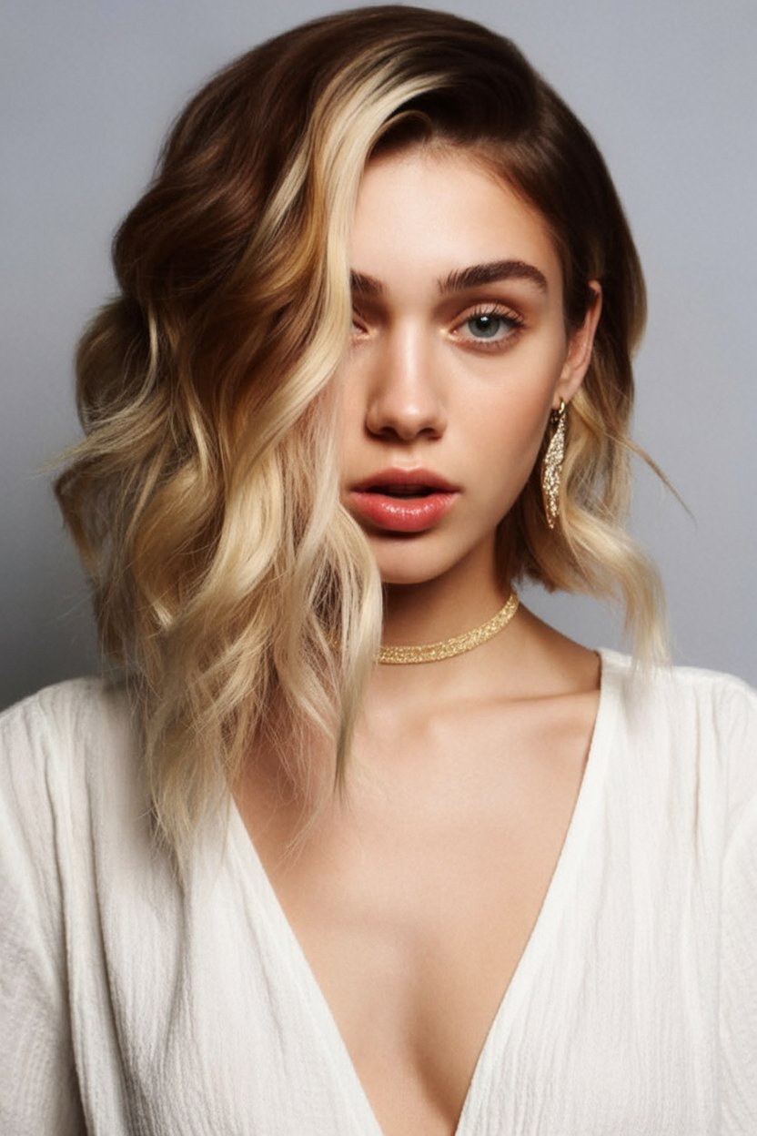 This asymmetrical bob is all the modern drama we love—in a super wearable way. One side dips longer with soft wavy pieces, and the other side tucks up close to the jawline and is cut into a gentle angle that focuses attention on the eyes and lips. The blonde with highlights throughout a deeper base provides depth and movement, so the cut looks different from every angle and feels new whenever you style it.
