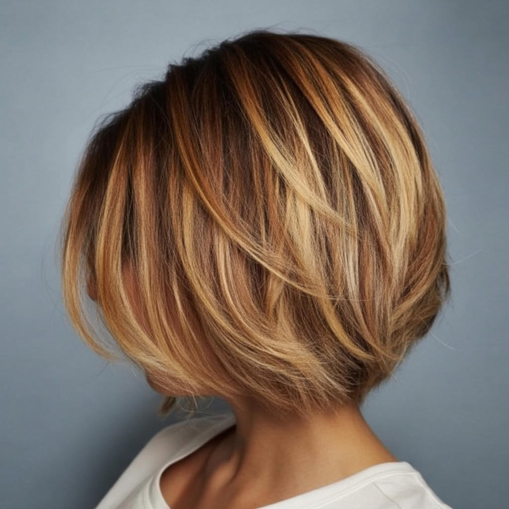 This round bob has all the height of a shorter stack but feels softer and more wearable. The back is a little stacked and graduated for a gentle lift, and the front pieces sweep forward in layered ribbons of warm blonde with highlights over a caramel base. The look is plush and dimensional, like a professional blowout that somehow holds for an entire week.