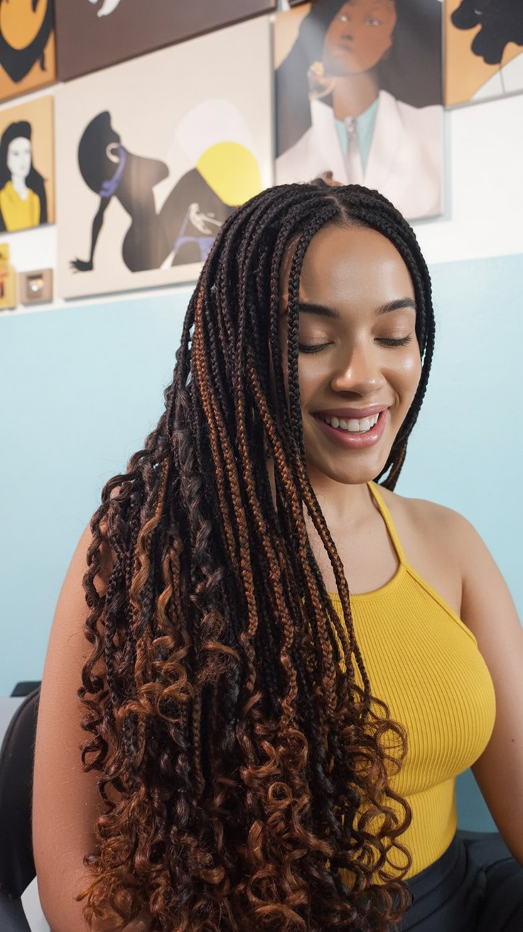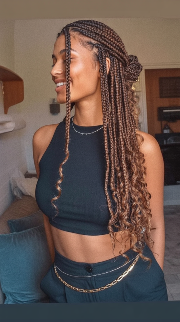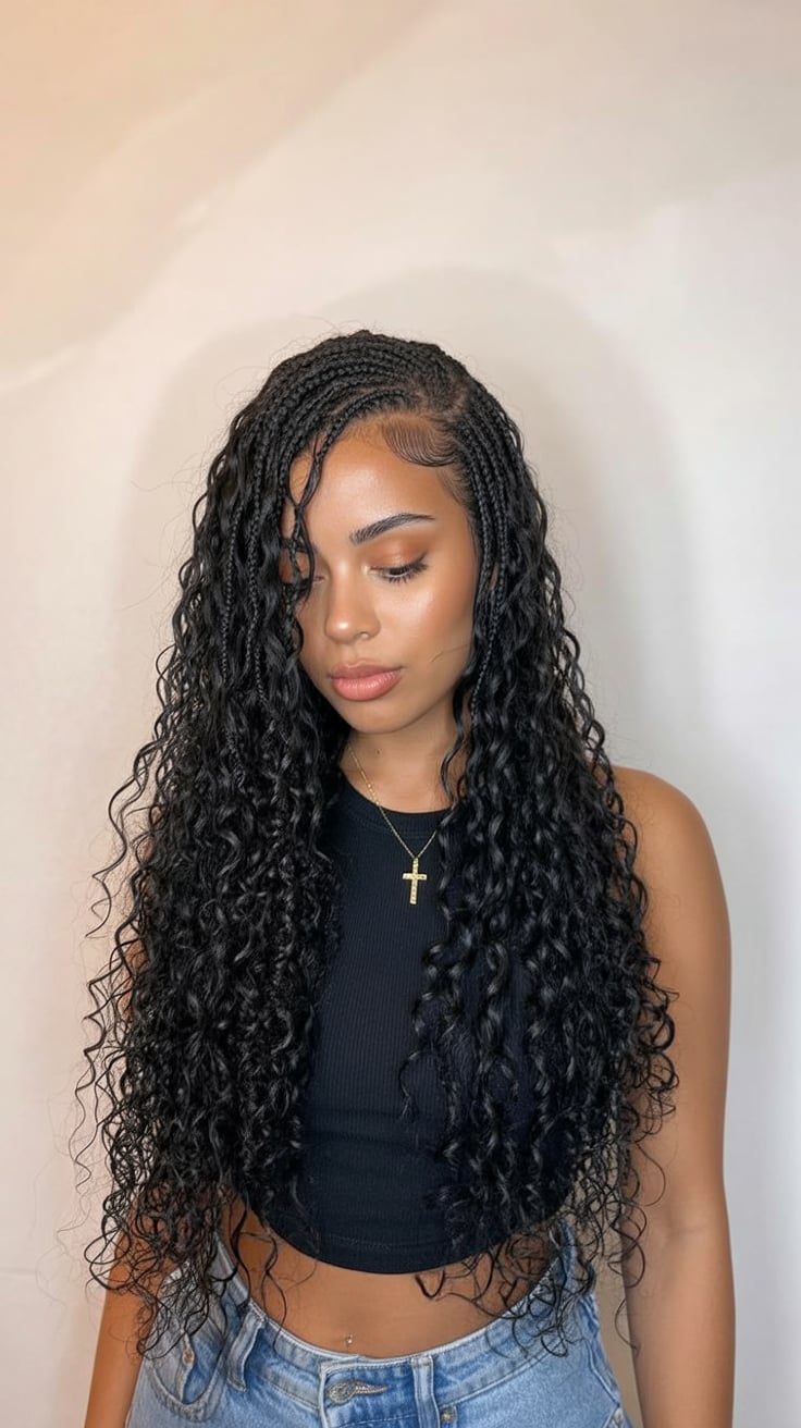This one feels like weekend beauty goals—soft, effortless, and a little romantic without being “too done.” The braids have that airy Boho vibe, and the curly ends bring movement that makes the whole look feel lighter and more playful. It’s the kind of hairstyle that makes you want to put on hoops and take yourself out, even if it’s just for coffee.