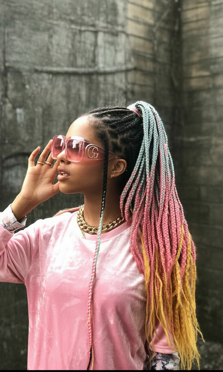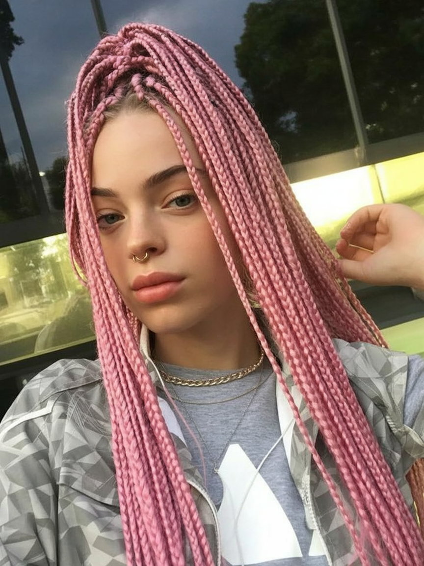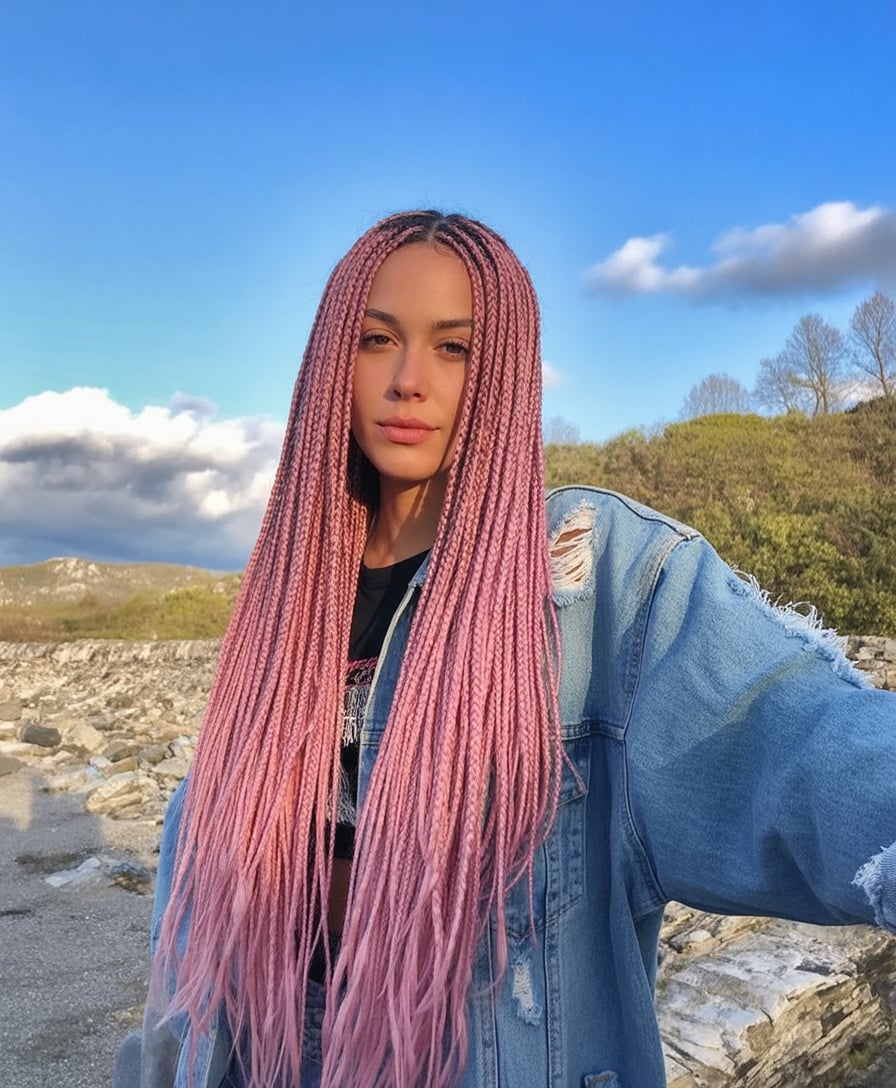 Pink braids are basically instant personality—bold, fun, and weirdly empowering. This shade feels playful but still chic, especially when the braids are neat and uniform, so it reads more “fashion girl” than costume. It’s a look that says you’re not afraid of attention… but you’re also not begging for it.