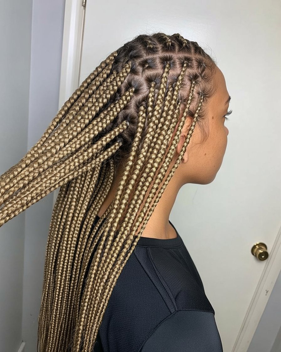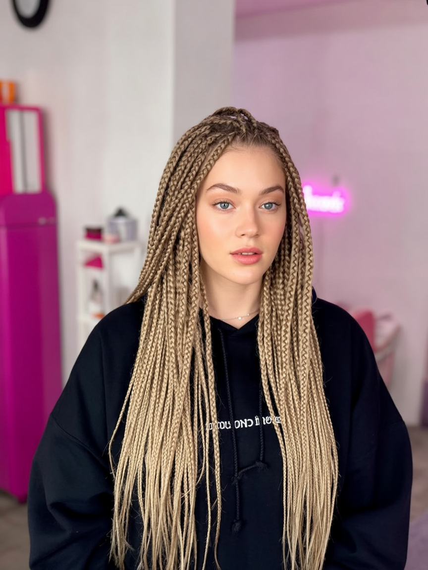 Blonde braids always give that “new season, new me” feeling—bright, fresh, and a little daring in the prettiest way. The size here makes the look feel modern and airy, and the color adds instant glow. It’s the kind of hair that looks amazing with simple outfits because the hair is doing the styling for you.