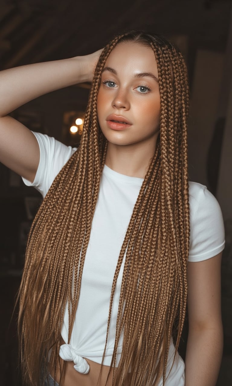 There’s something instantly “put-together” about warm honey braids—they read soft, glowy, and expensive without needing a single extra step. The color brightens the face, and the long length gives that swishy, main-character energy, especially when the braids are kept slim and uniform. It’s a mood: effortless, feminine, and quietly bold.