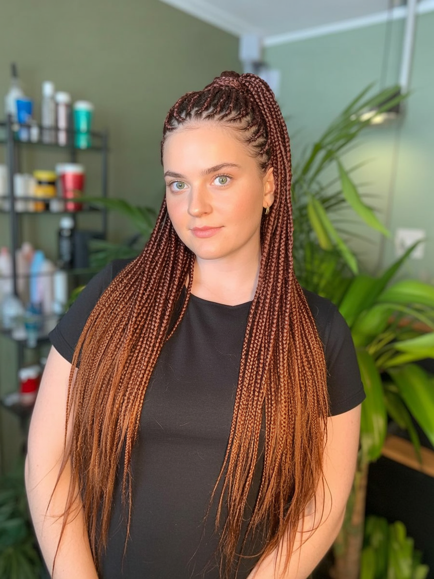 This half-up pony has that “I didn’t try… but I absolutely nailed it” energy. The warm auburn tone feels rich and grown-up, and the way the braids fall long and sleek makes everything look instantly more polished—like your outfit got upgraded without you changing a thing. It’s confident, flattering, and just a tiny bit flirty in the best way.