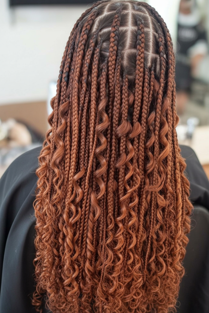 This is one of those styles that makes it look like you have your life together—even if your day is pure chaos. The warm auburn tone gives that rich, cozy glow, and the mix of sleek braids with curly ends feels effortlessly pretty, like you’re leaning into your feminine side without going overly “done.” It’s soft, textured, and honestly kind of addictive because the movement makes the whole look feel alive.