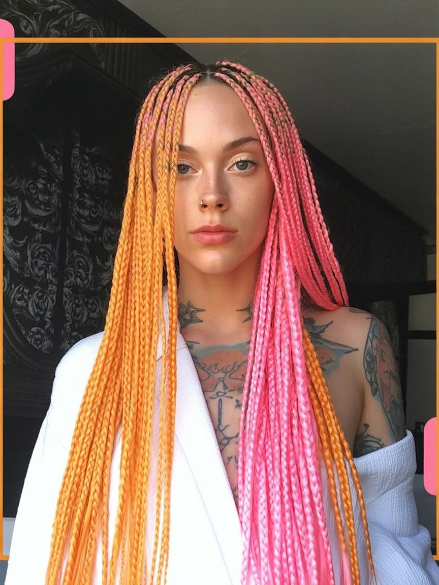 If you’ve been waiting for a sign to try bright braids, consider this it. The easiest way to keep it flattering is to keep the braid size consistent and let the color placement do the work; it photographs beautifully and looks intentional even as it grows out. For styling ideas, wear it down for maximum impact, or pull it into a high pony to show off the two-tone contrast. Long braids in bold shades can still look polished—just keep the top smooth with mousse and choose a few simple accessories if you want a tiny sparkle.