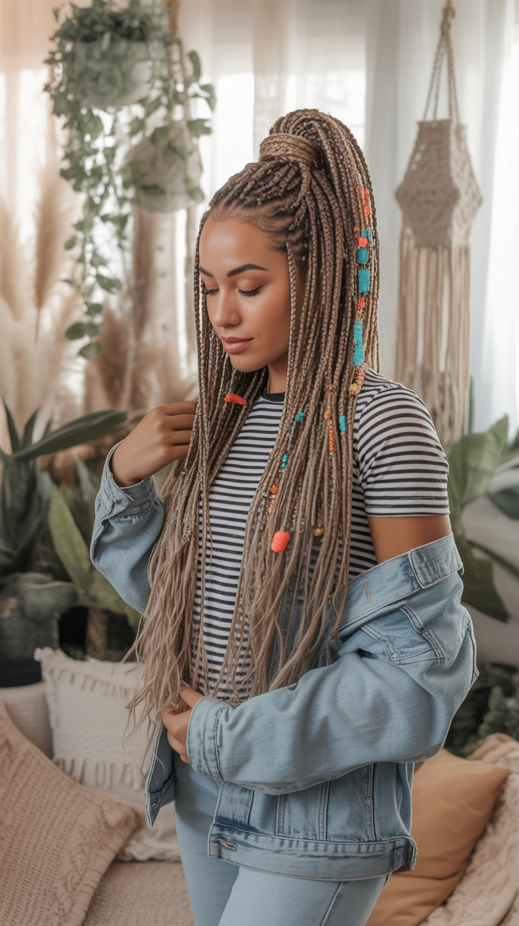 If you’re wondering what to wear it with, think clean basics plus one statement: glossy lips, bold brows, and hoops or ear cuffs. This is where accessories really shine—beads or wraps placed down the ponytail look intentional and modern. For styling ideas, keep the base smooth with a bit of mousse, and secure the ponytail with a soft band so it stays comfortable all day. Long braids look amazing in a pony because they show off the length while keeping hair off your face—perfect for busy days, warm weather, and travel.