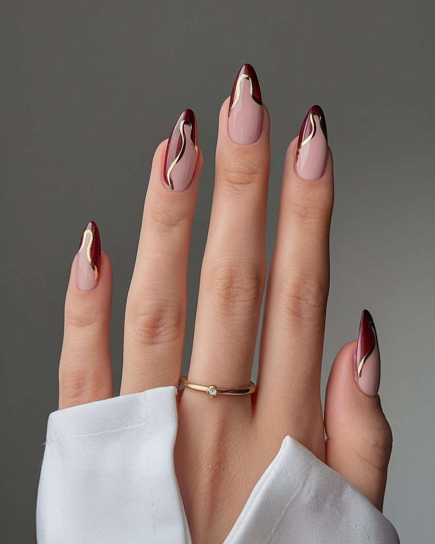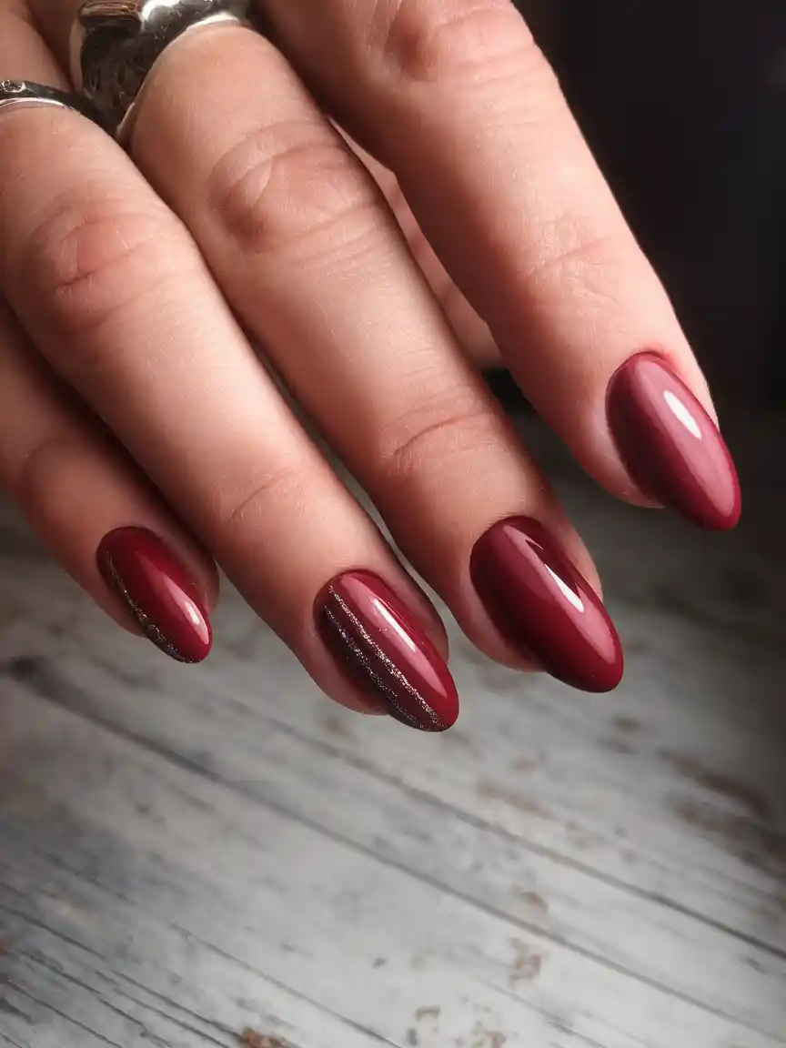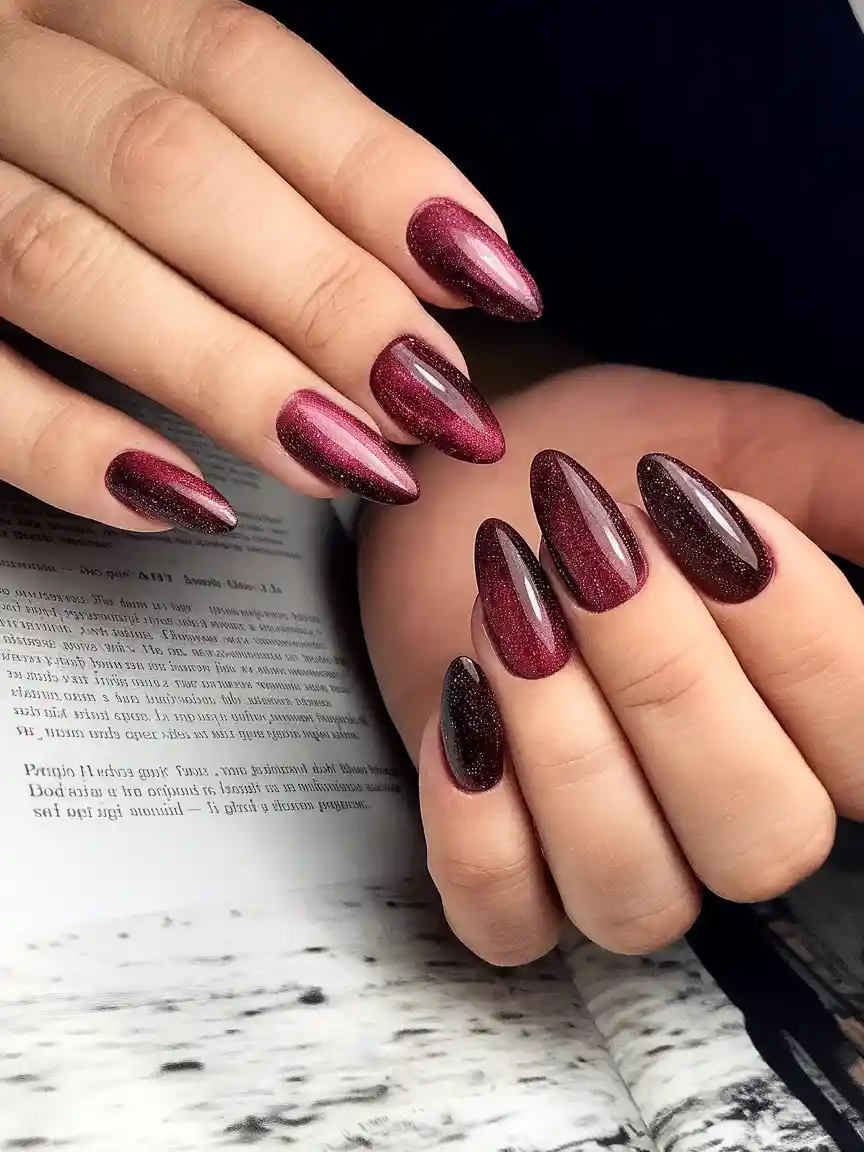 The style suits perfectly in almond and oval shaped nails and more so when you are fond of nail styles that transform gradually with motion. This is perfect fall and winter evening, it looks lovely with gold jewels, velvet, and a berry lip. A standout among burgundy nail ideas for 2025.