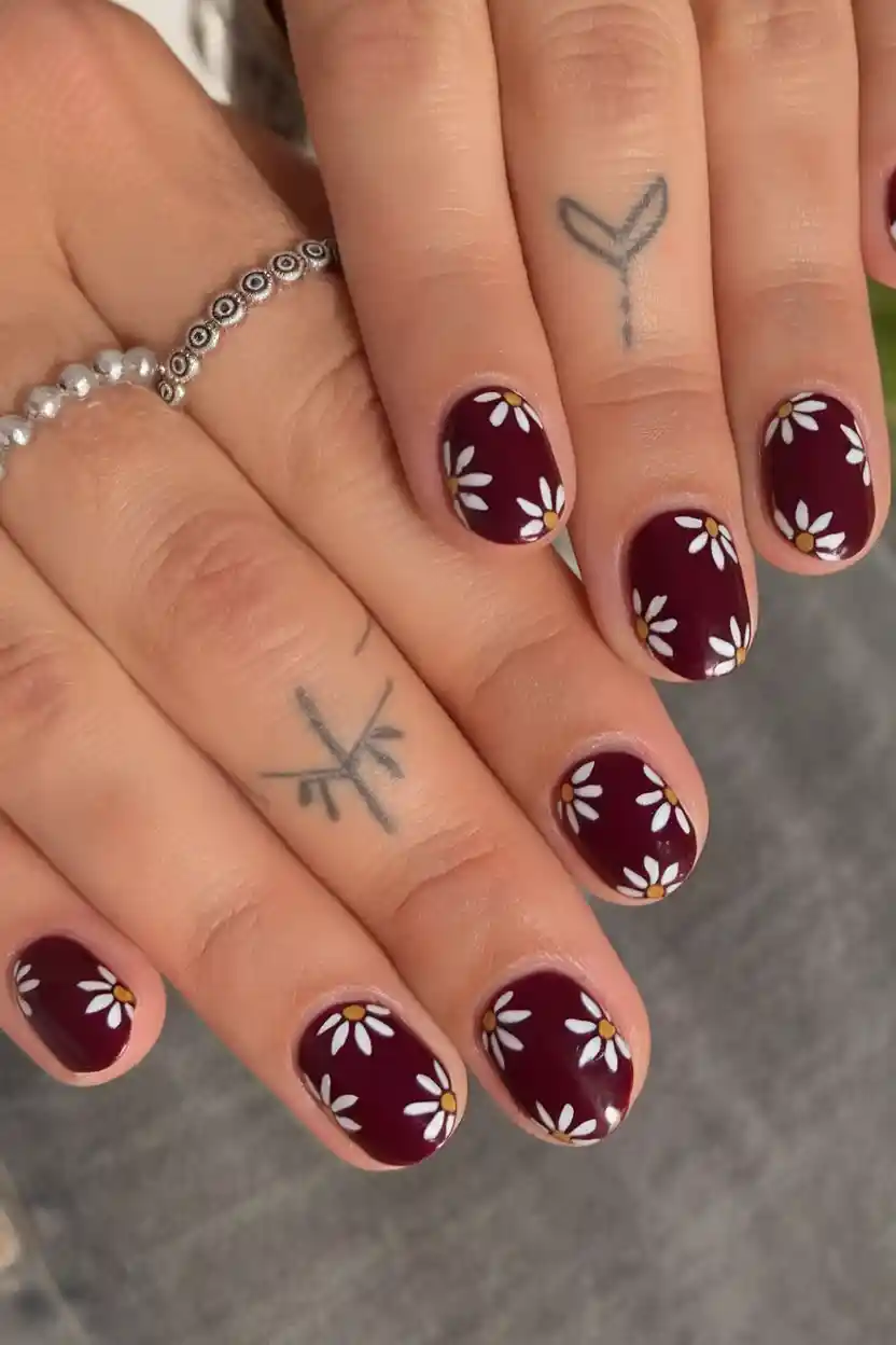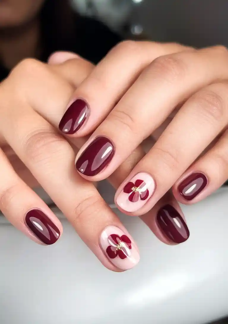 It is particularly effective in the case of the short and medium-sized nails with rounded ends. It is great to wear when ladies need some seasonal design, but they do not wish to make it a center of attention on their personality. This gloss and florals balance provides a fashionable sense of the burgundy nail concept in 2025.