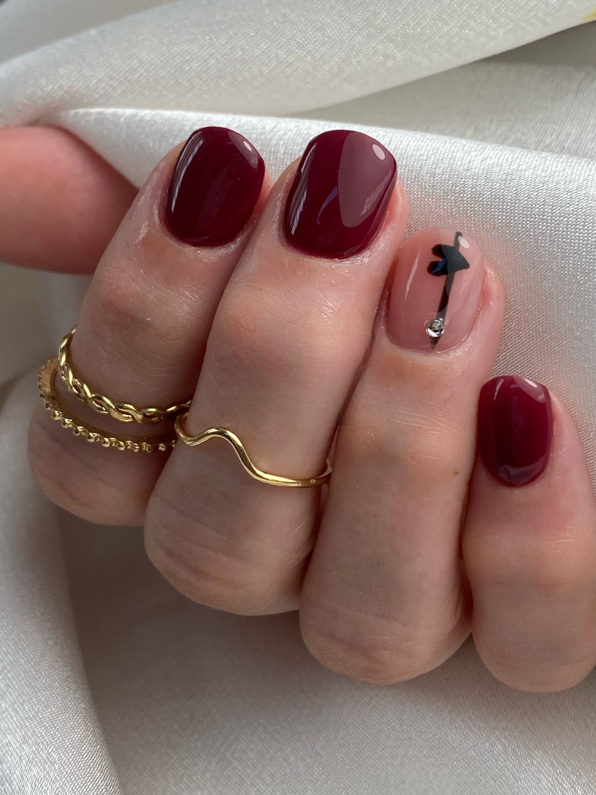 This is a mani that shows less really is more. Rich burgundy is combined with one thin stripe of slightly glitzy haze the very detail that alters the whole atmosphere of the set. It’s minimalist without being boring, sleek without being flashy.