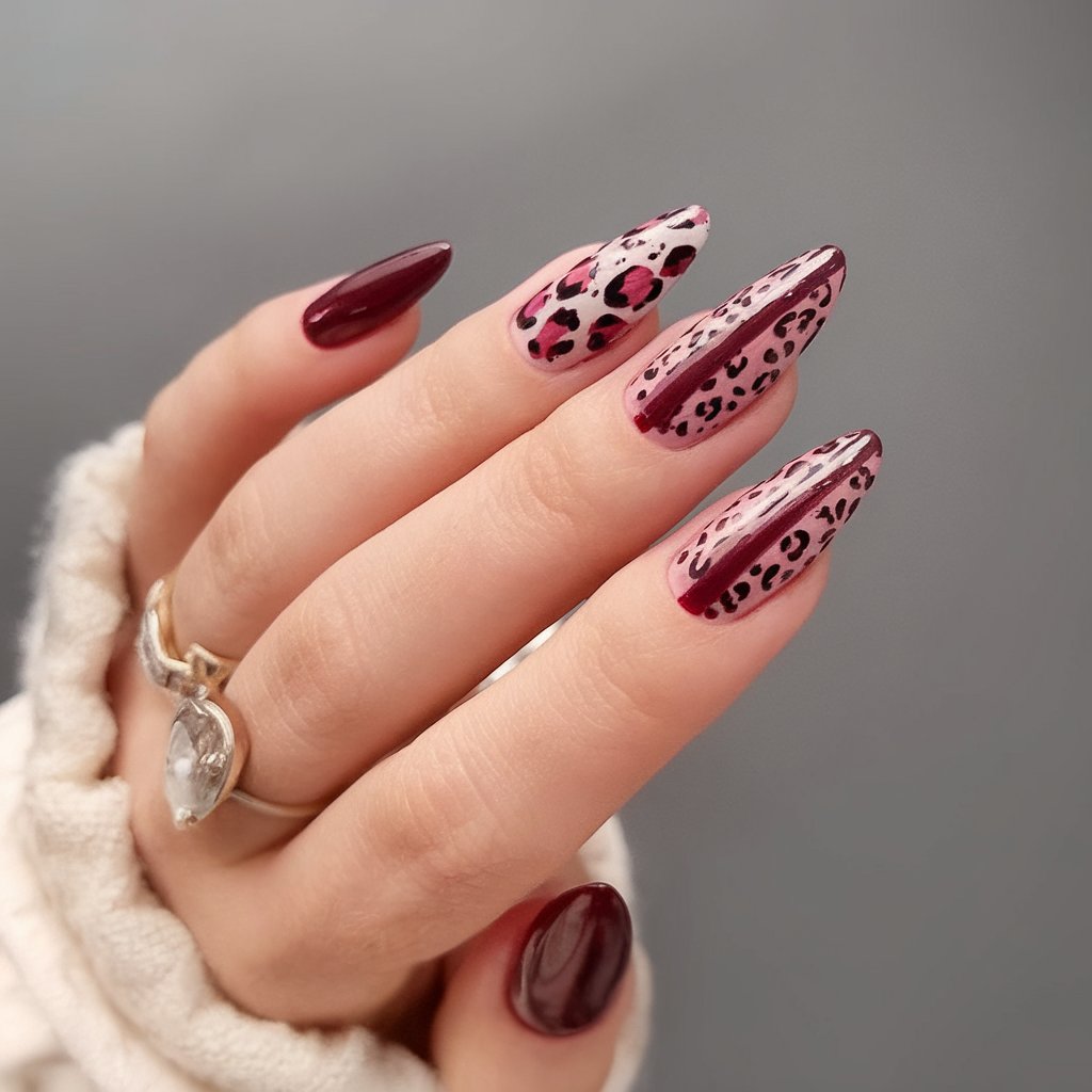 The style is daring; a mix of burgundy and leopard print that is on the border of edginess and class. The combination of vertical color block and animal print introduces the movement and creativity so that each nail is a moment.