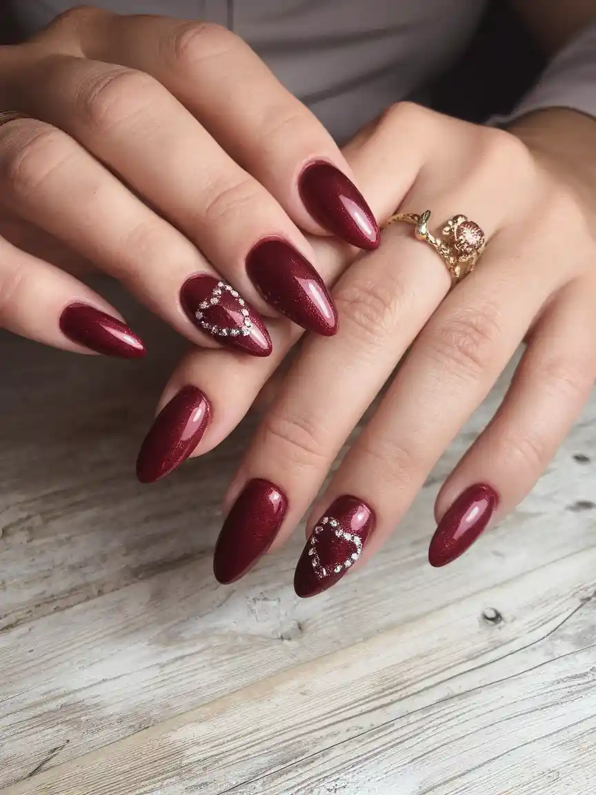 What do you prefer, traditional or funky? It turns out that burgundy nails 2025 are not the only way to treat dark and gloomy reds. With glamorous cat eye finishes, flowery artwork and valentine worthy accents, this ensemble is overloaded with styles that are sophisticated, contemporary and somewhat risque. Do it, make it your own, share with your nail tech, and get out there with a hand that tells, “I still got it,” right in time.