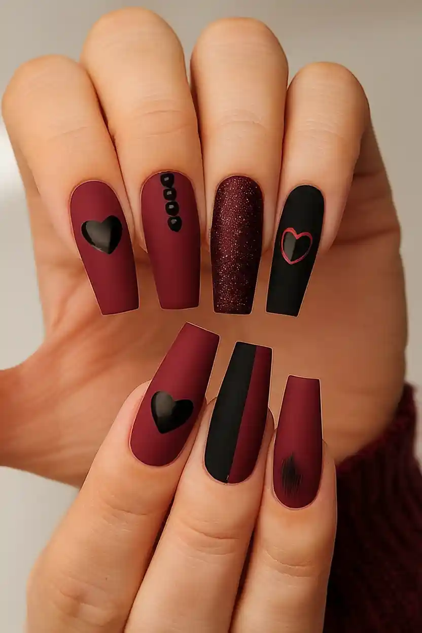 Sexy and artistic, this coffin-shaped matte set is mixed in the most unexpected coloring: burgundy, black, and shimmer. Every single nail is a story of its own: hearts, strips, matte and glossy accents in one collection of head lines.