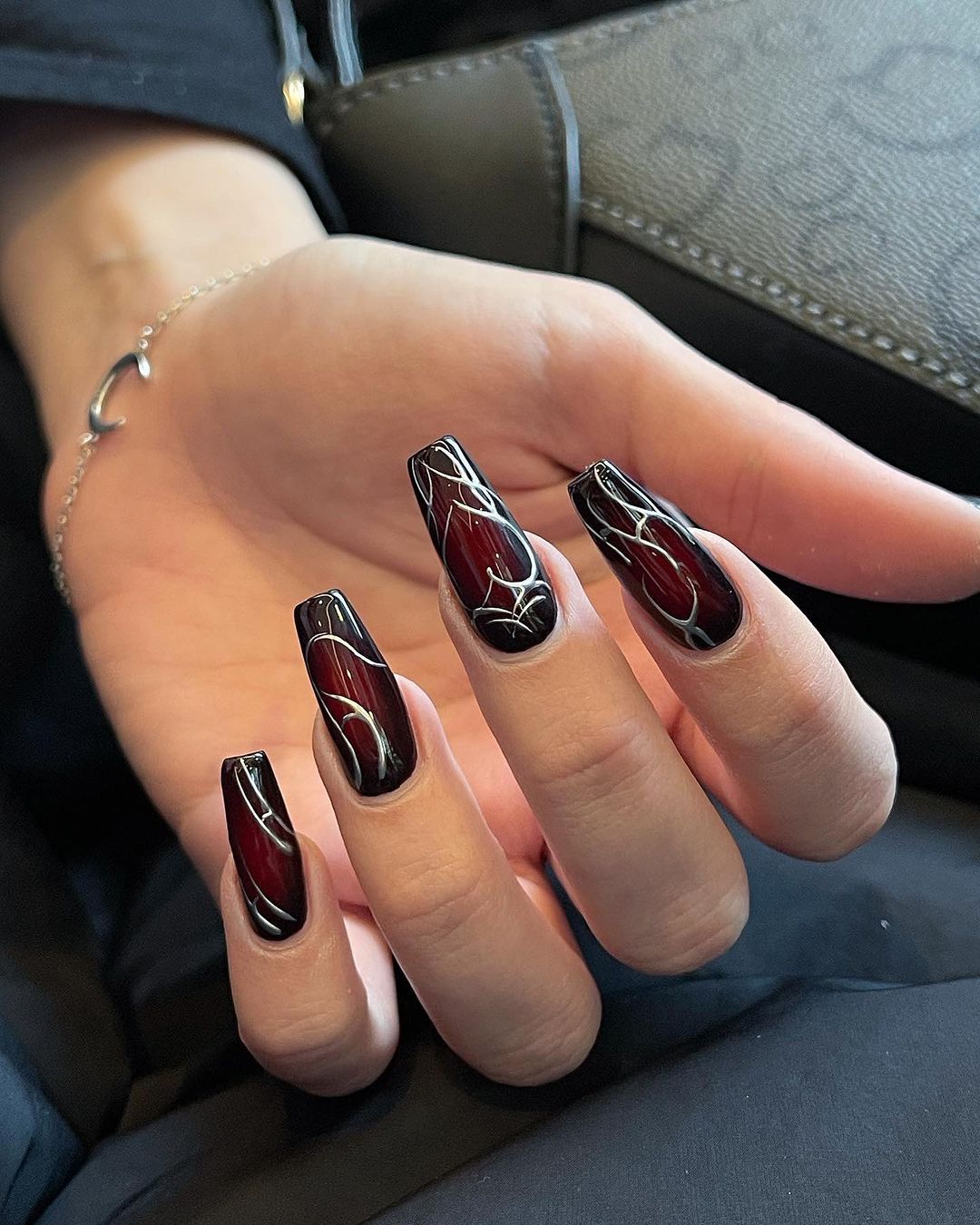 This style goes best with long coffin shaped nails and goes hand in hand with rings and some dark attire. It would be best applied to fans of dark nail art yet with that something special, and thus, it would be recommended to wear it both with fall fashion and cool glamour.