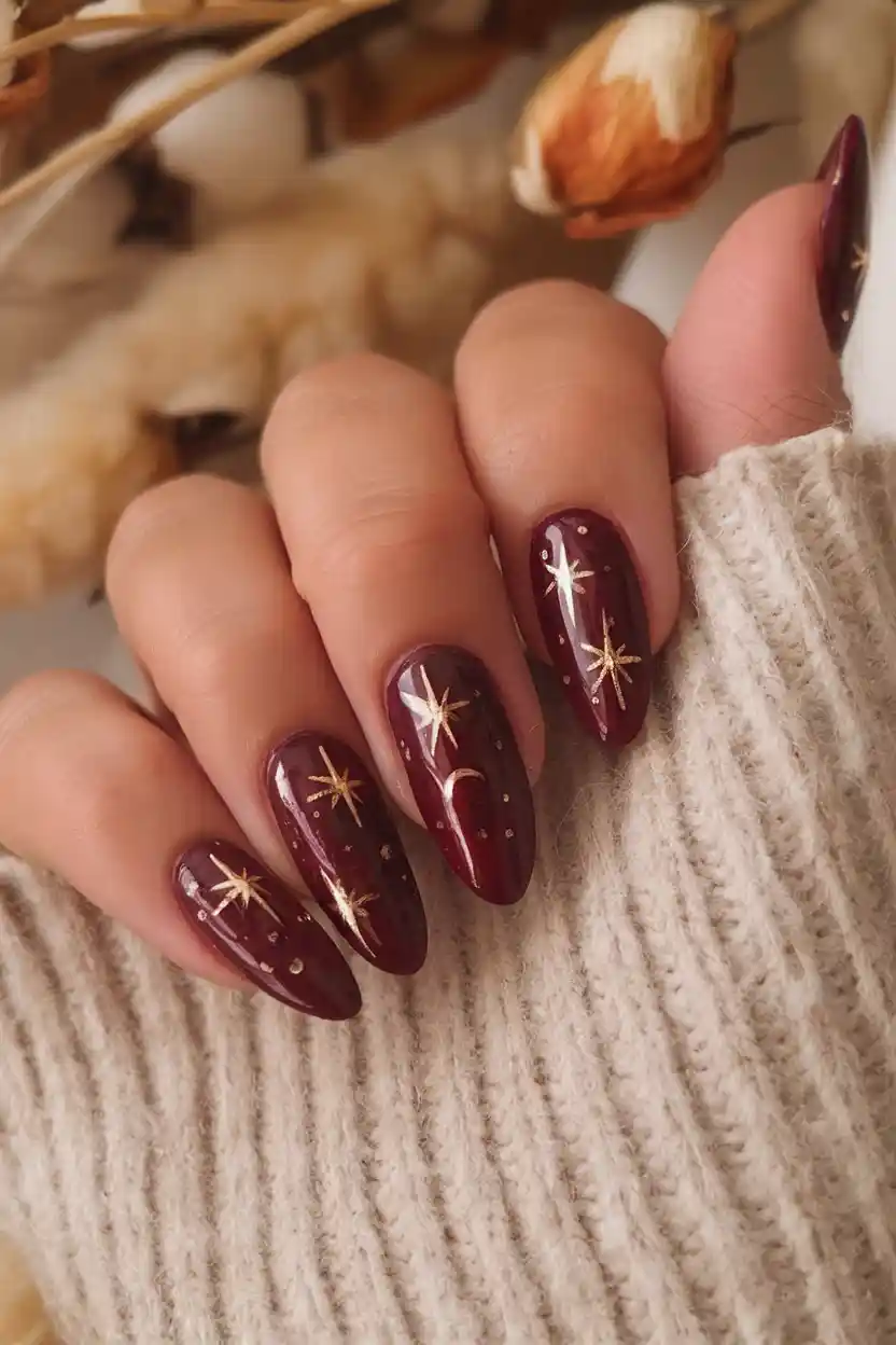 There’s something deeply enchanting about these cosmic burgundy nails. The polish is so other-worldly high-gloss that I would compare it to a night sky, with hand-painted stars in golden foil. It is possible to sight a wish as being made on these fingertips. It is broody and enchanted and ideal on a stargazing night, or a good book, a glass of wine.