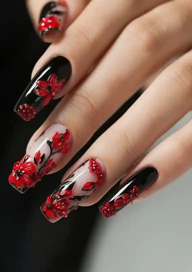It is floral nail design and never before. Shiny black and deep red 3D petals cross in a style that is half couture and half jungle. The flora is almost hand-cut into shape on the glass and it literally has been.