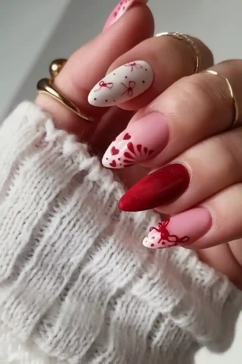 Sexy, gorgeous and completely adorable This mixed art nail-craft is a love note in a bottle. And every one of these nails is a tale of love and merriment: deep matte burgundy and emotive red dots, sweet dots and hearts, ribbon-style scrolls, folds and shapes. It is very warm but also sexy, warm like wearing your favorite sweater on a winter date.